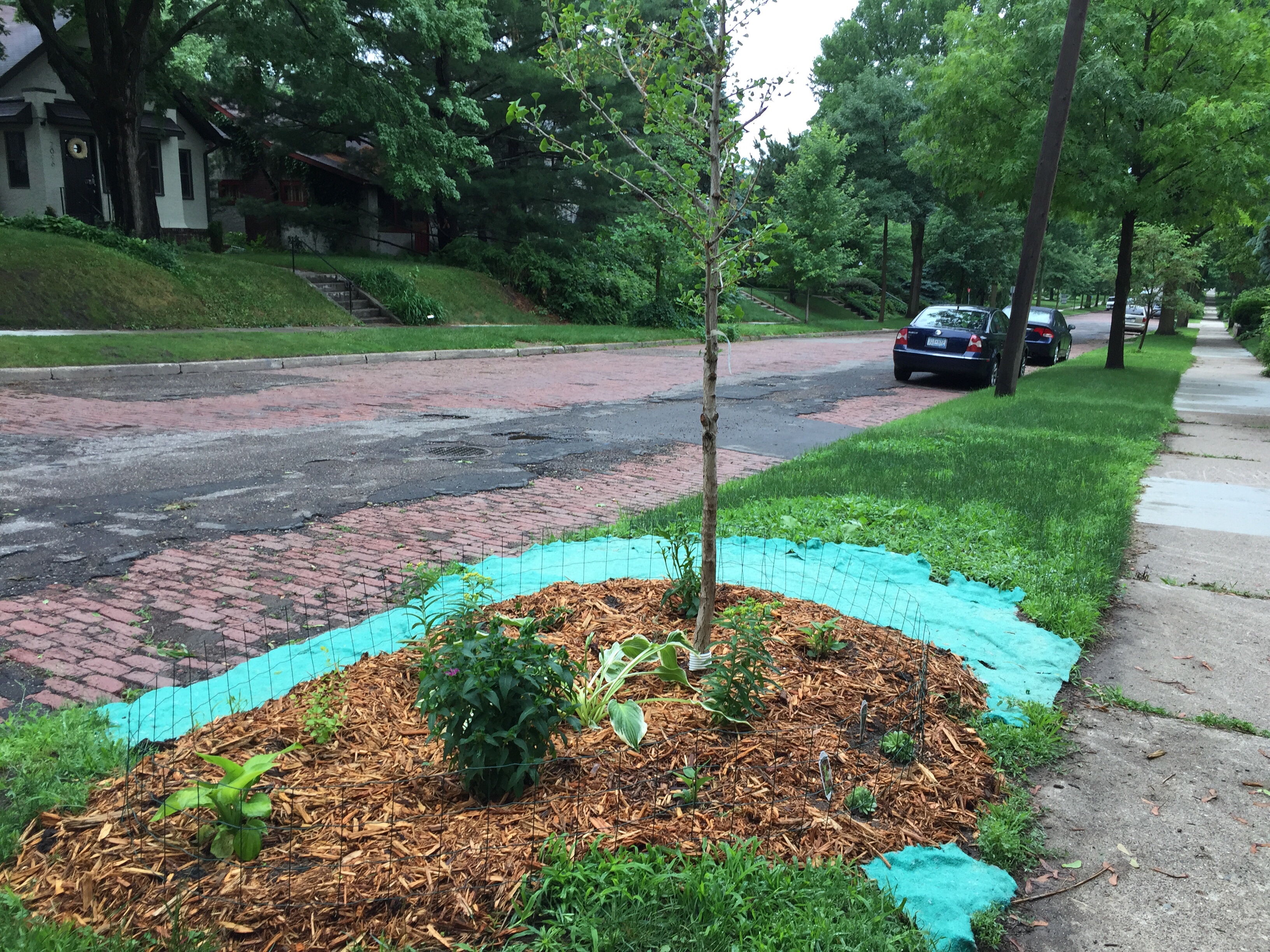 Finally replaced the giant elm that the city removed last year. The ginkgo is looking good, and we’ve covered the huge dirt patch. Rabbits ate my dwarf dogwood so we had to add some fencing. I hope we’re done with it for a while!