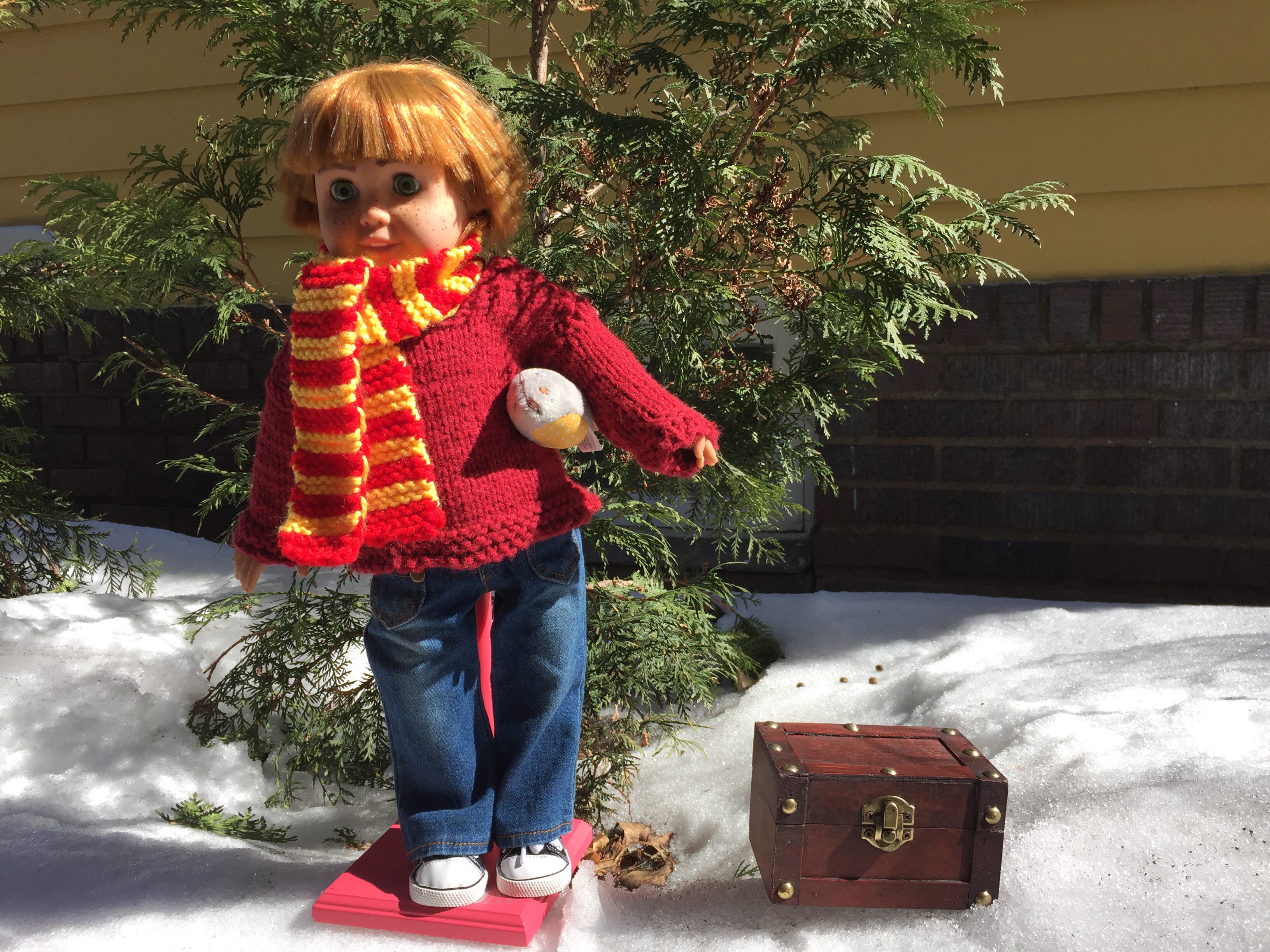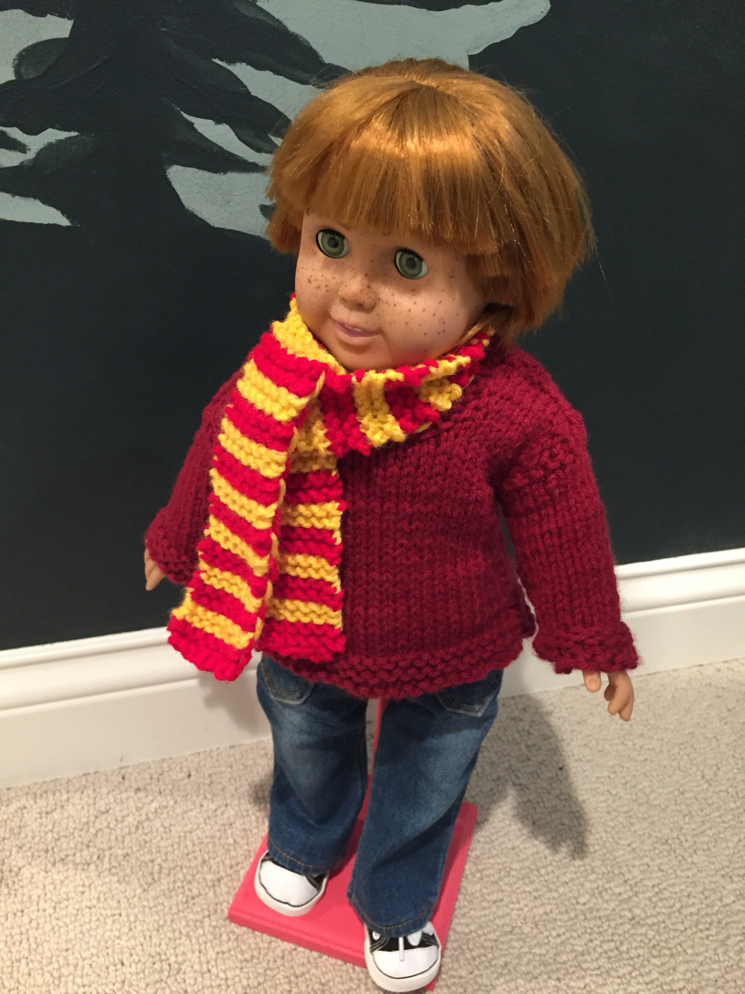 We were inspired by one of Ron’s biggest fans (our friend, Sophia) to transform a gently used 18 inch doll into a gift that any HP loving kid could appreciate! It was a really fun challenge- starting with a red-haired doll from eBay, we began by cutting her hair and eyelashes, removing her painted lips and adding freckles and eyebrows. With a knitted Weasley sweater and some wizarding accessories, the transformation was complete- almost magic!