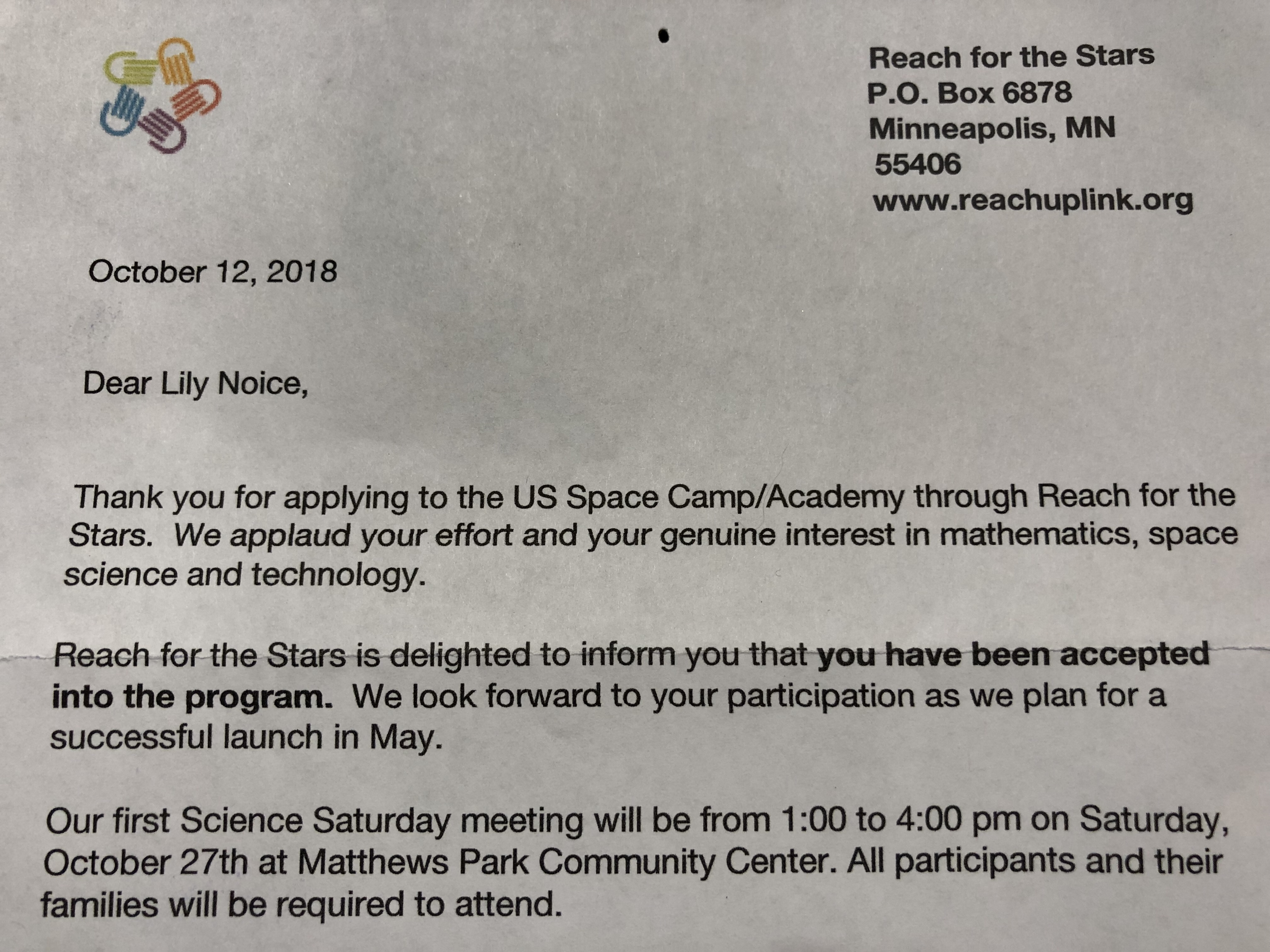 Lily applied for and was accepted into Reach for the Stars Space Camp! She and her friend, Zoe, are part of a group of 32 kids from Minneapolis and St. Paul. You can read more about the programs here. Select “Program” at the top for an overview and select “Content” and expand the Science Saturday and Space Camp tiles to see more – Lily is doing both!