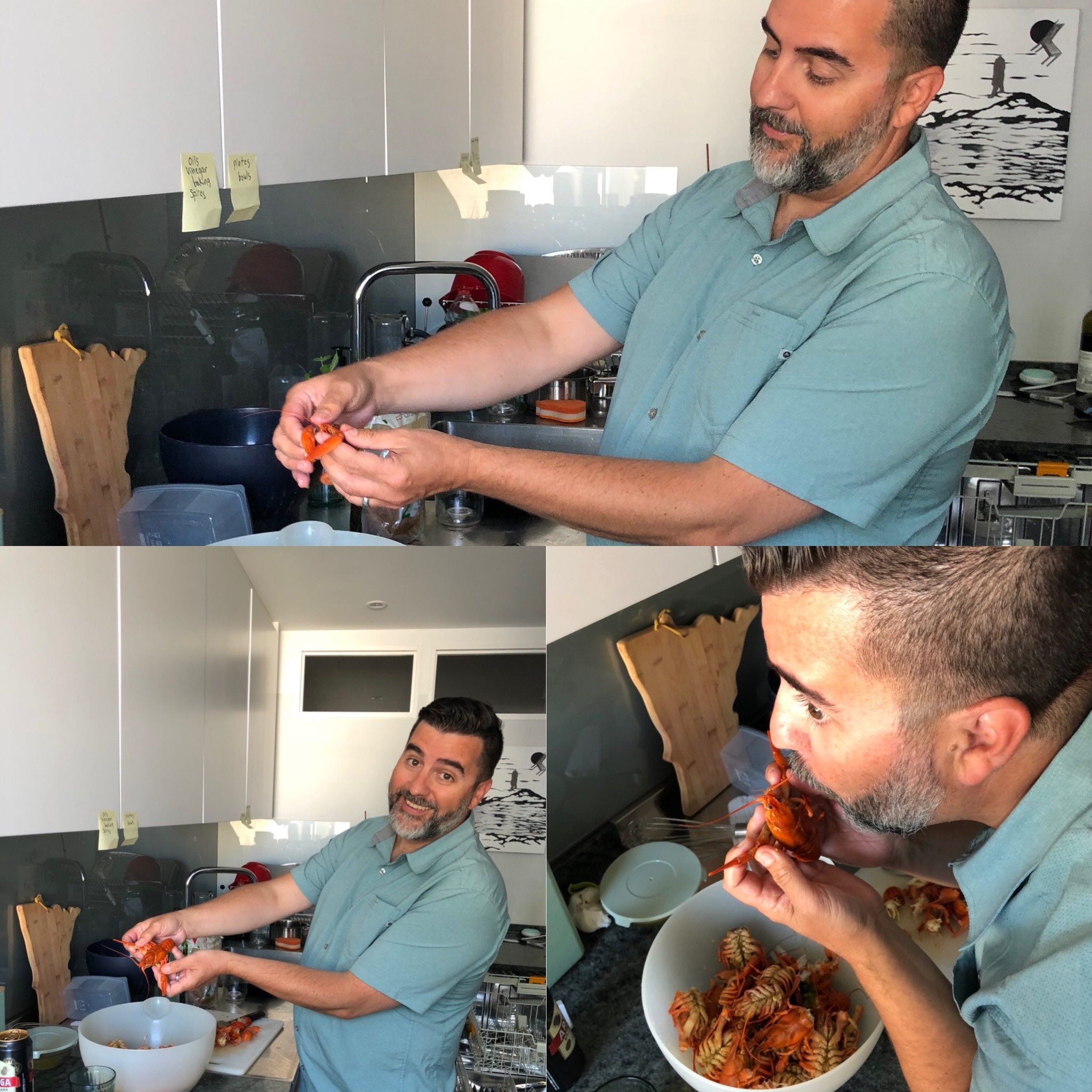 I made raspberry dark chocolate ganache layer cake. Bryant made his macaroni and cheese speciality, with crayfish this year, the Swedish lobster, because they’re in season.