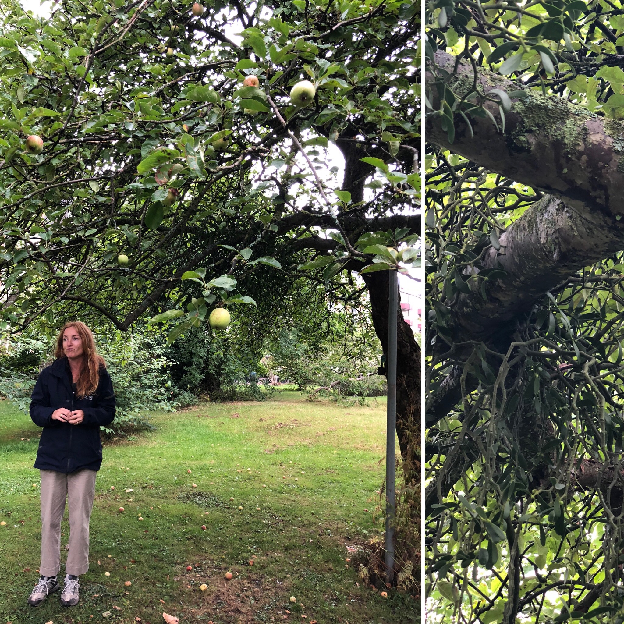 The mistletoe is deliberately grown on the branches to provide winter interest (and for good luck). This mistletoe, under the Linné Apple canopy, has been growing for around 25 years.