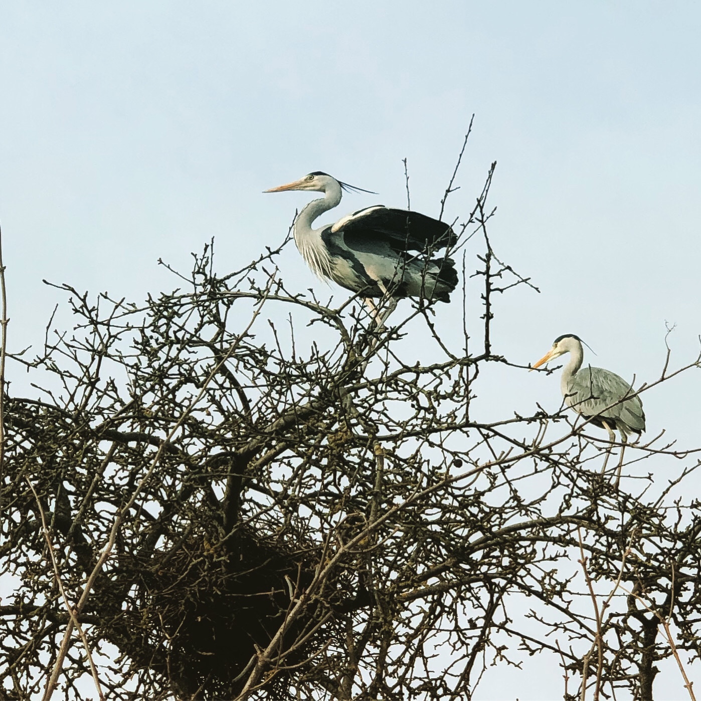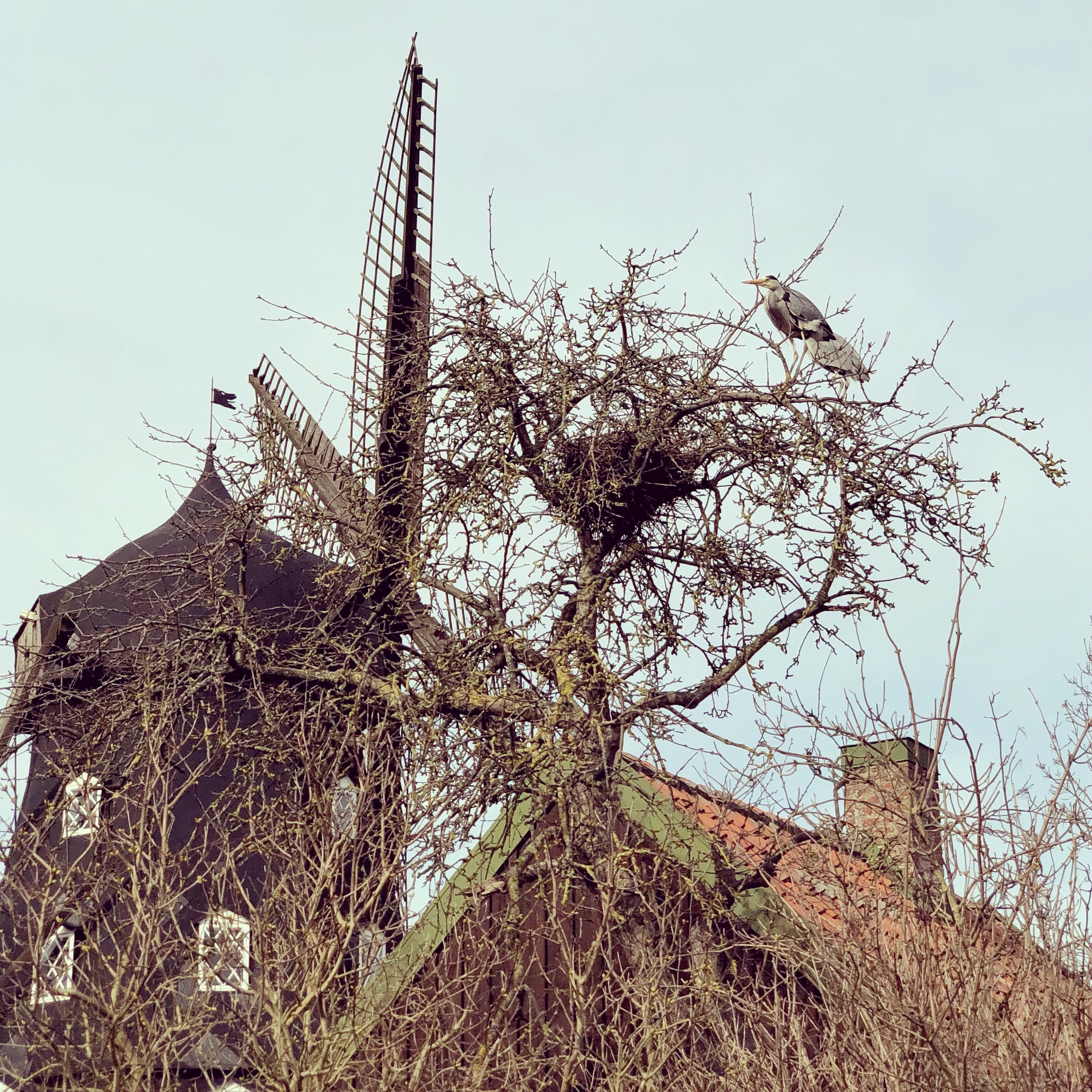 These gray herons seem to have a nest near the windmill and they were staying close by.