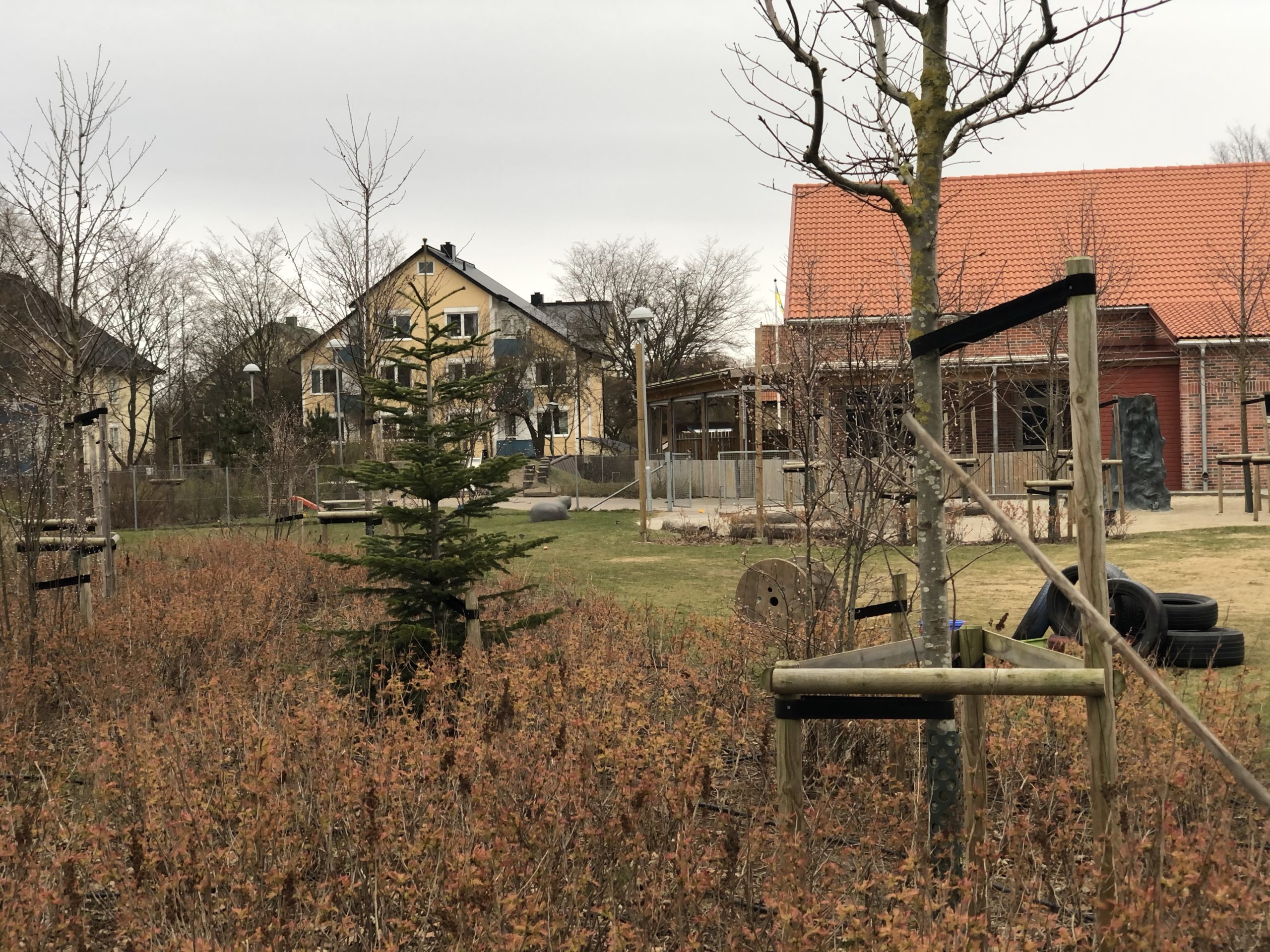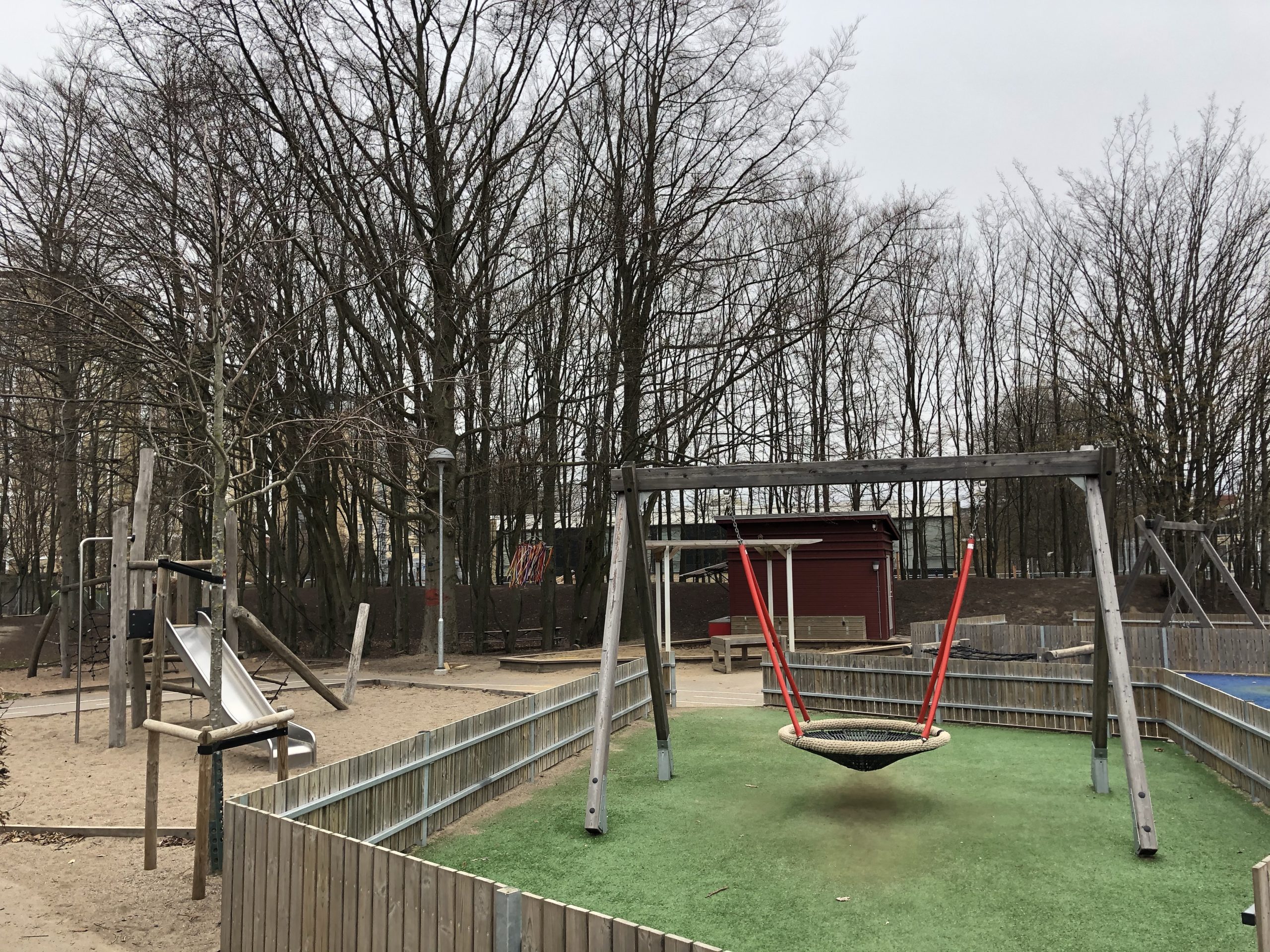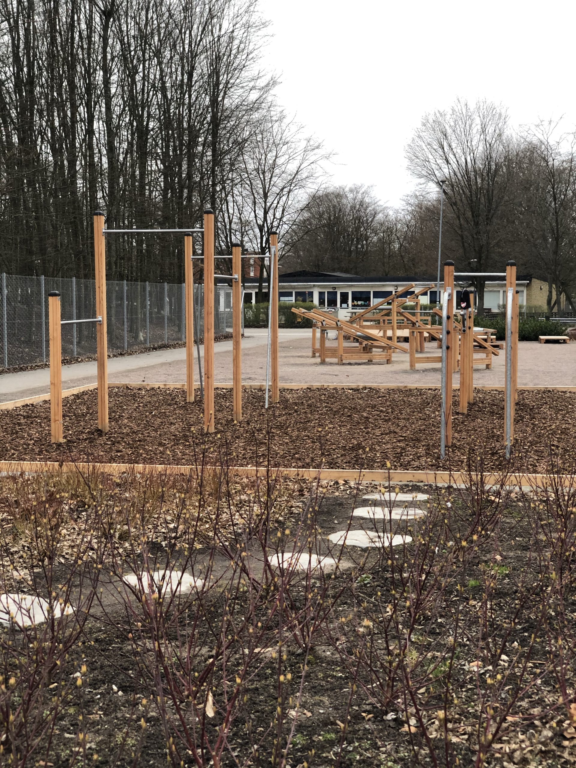 Parks are amazing in Sweden. I read somewhere that it is considered a basic human right that everyone have green space and outdoor activities within easy access. Playgrounds are everywhere and most of them have at least one wooded area for nature play. We live within three blocks of several lovely parks. The newest is an “Out-gym” a quarter mile from us, behind the CherryBerry (körsbär) preschool. I try to stop by for a few exercises every day.The out-gym is on the back side of the trees. Preschoolers spend much of the day out here. They even have a vegetable garden that they “tend” They often call out and wave to me and other neighbors who pass by. The area is usually quite busy but these photos were taken early on a Sunday morning.