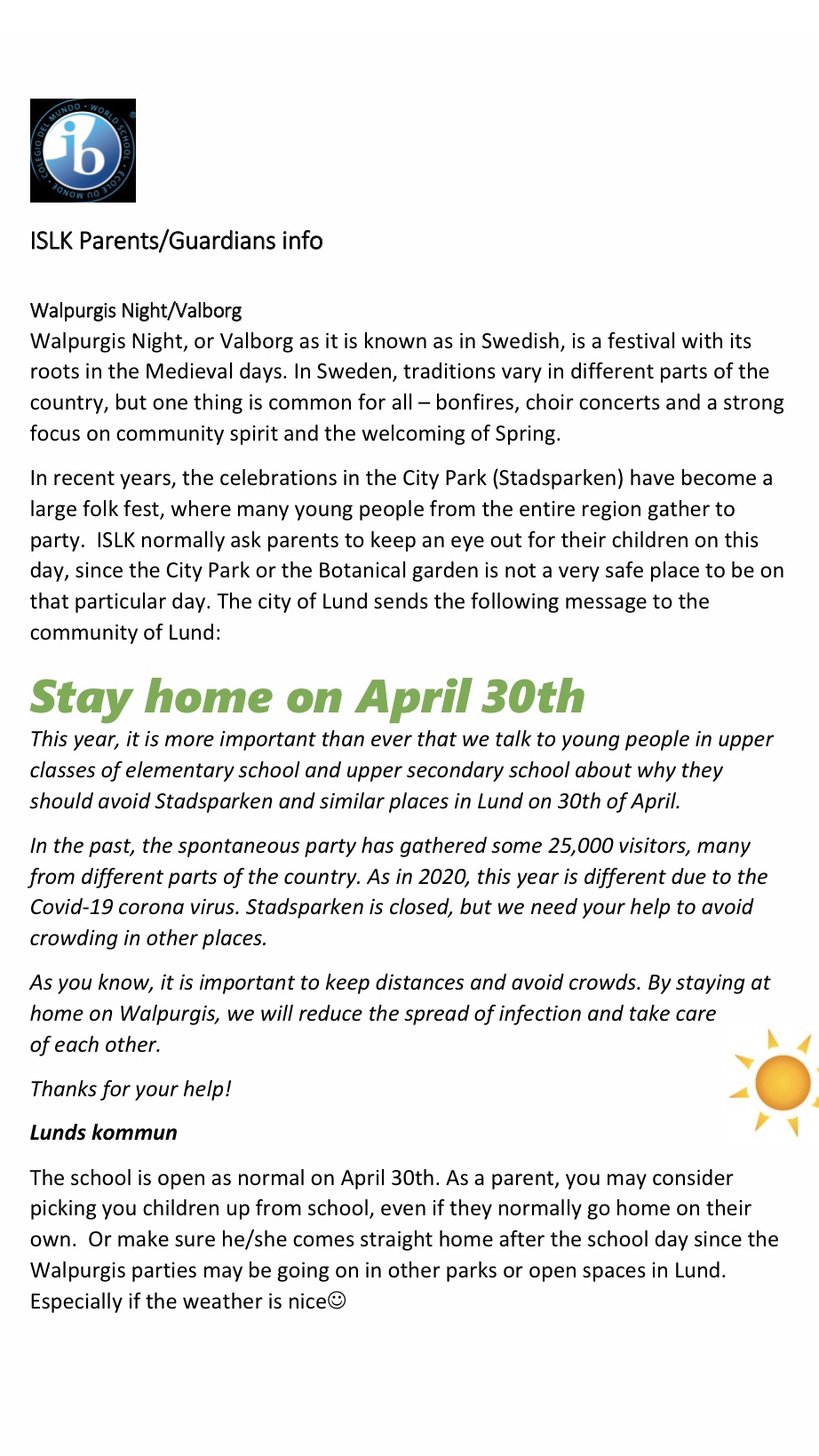 Lund is employing multiple strategies to stop large gatherings in local parks tonight. Saint Walpurgis night, originally a pagan, equinox (Beltane) festival turned folk fest, with singing and bonfires has in recent decades become a huge party for students who have just completed their Spring exams. Lund has possibly the largest (unsanctioned) party in the country. Authorities have been preparing for weeks.