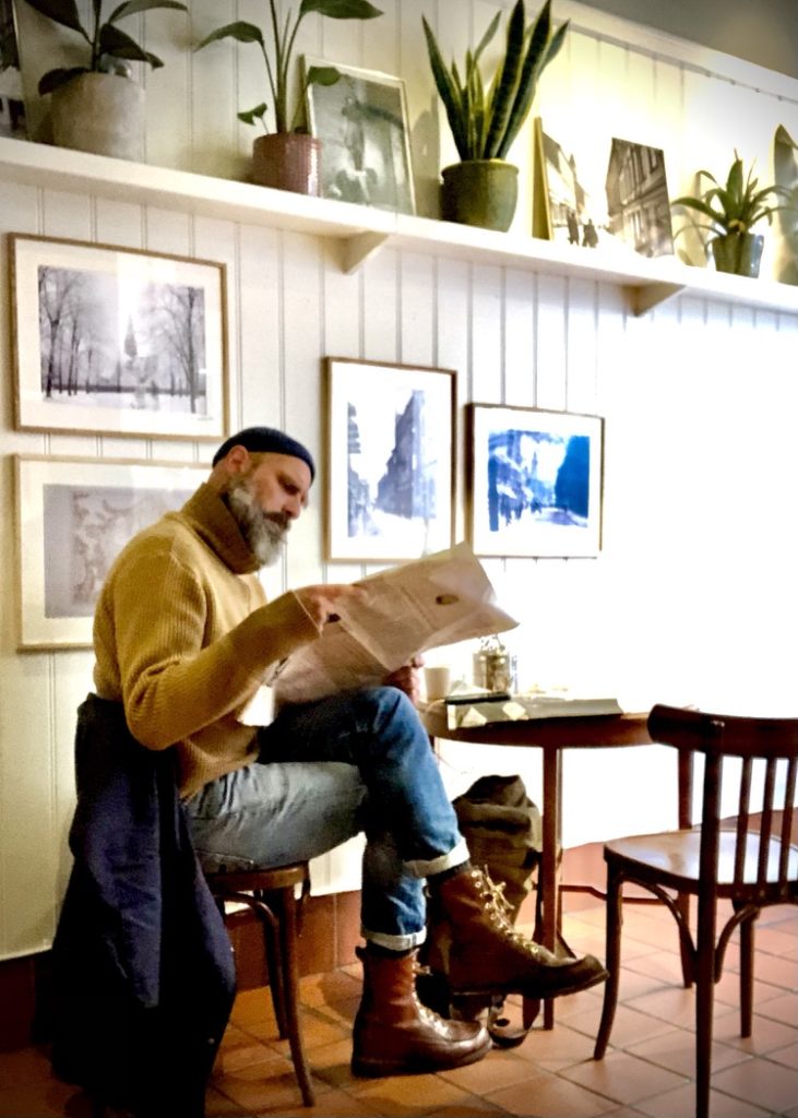 Bryant and I often walk to Broder Jakob’s for coffee and baked treats on Saturday mornings. It opens earlier than most bakeries and I love the atmosphere. The colors and decor are my style, with creamy white, and pinkish beige walls, high grey-blue ceilings, soft, elegant lighting, lots of plants and vintage photos. I just love relaxing inside or in the patio nice weather. I’ve never taken pictures because it’s always full of people and it feels awkward to photograph them. Then the man sitting at a table across from us arranged himself in the perfect vignette. He looked so much like a painting that I pretended to take a selfie and took a photo of him over my shoulder. I’m still amazed at how a portrait composed itself! Doesn’t he look like an impressionist painting?!