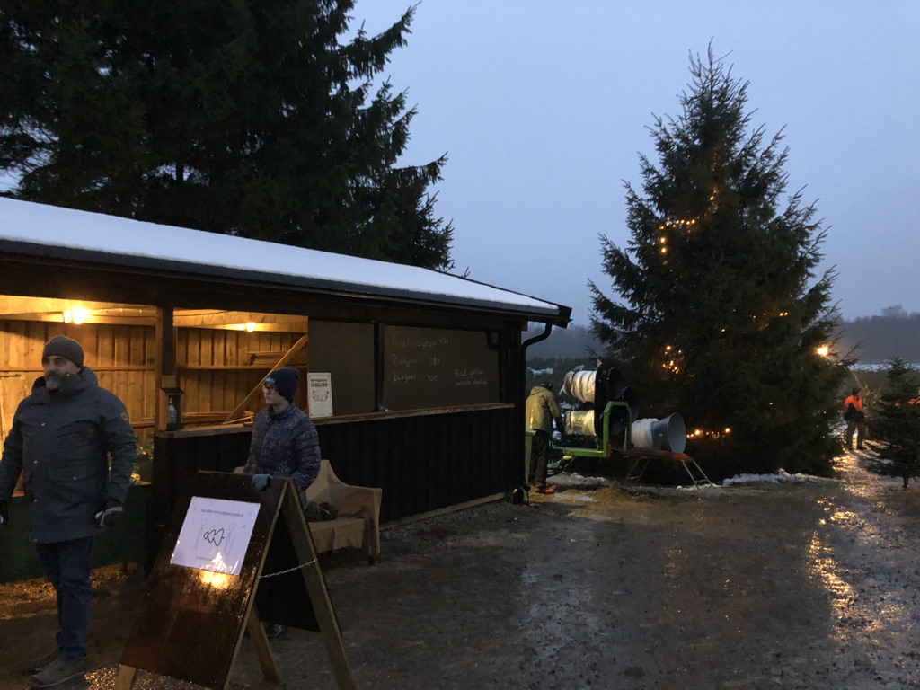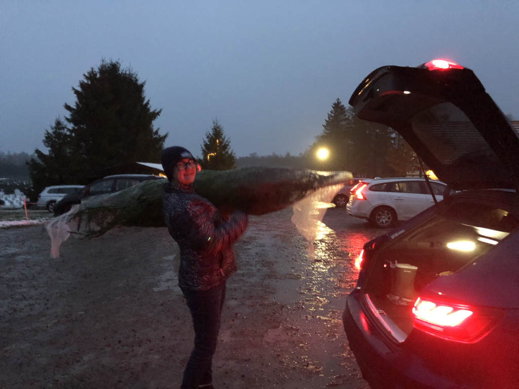 After the Julbord, we drove in search of a Cut Your Own Tree Farm per request of the younger Noiceling. The older one was home recovering from a cough. Unfortunately it was rather difficult to find, and by the time we arrived it was pretty dark. So after looking around a bit we settled on a pre-cut tree. Now we know how to find the farm next year.
