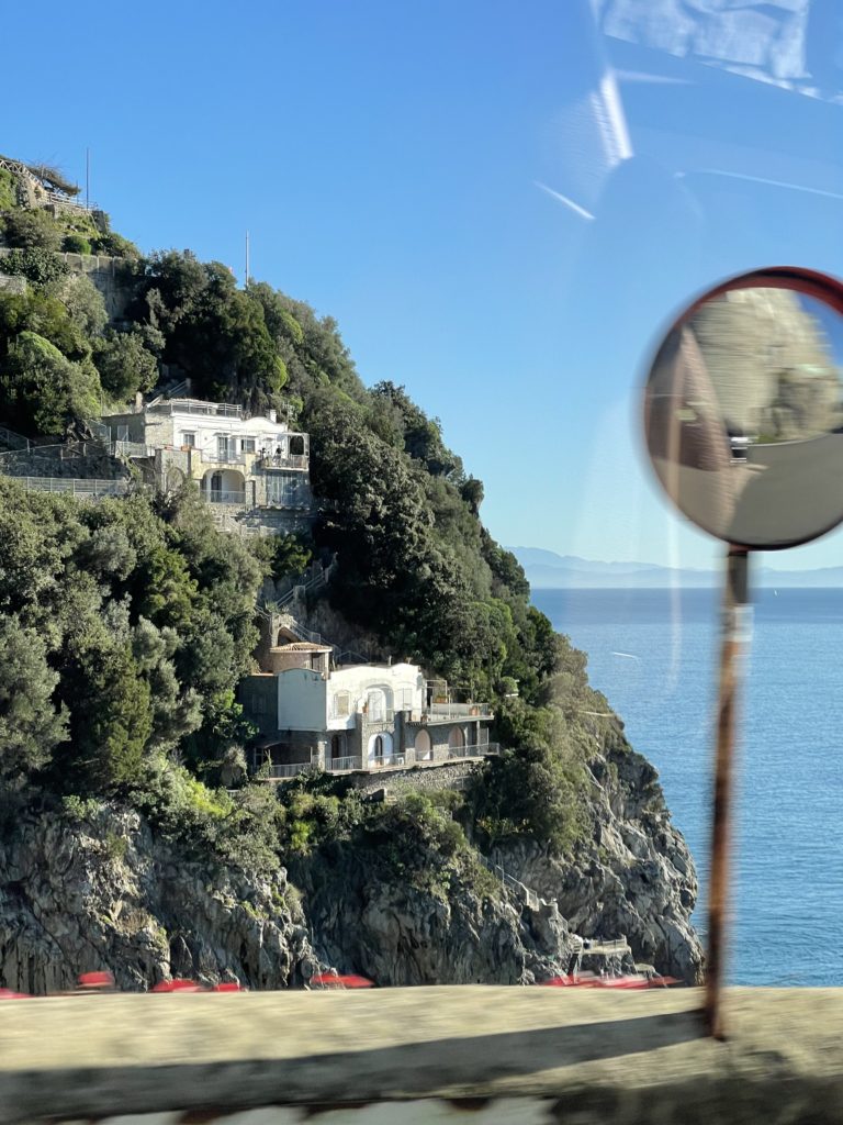From Rome, we took a train to Salerno (saw Mt Vesuvius from the train), and then a shuttle to Amalfi. The coast road is REALLY twisty, and we saw a lot of cyclists of all kinds enjoying the curves and the scenery. Unfortunately, the curves from the back seat of a van made for some pretty motion-sick people! H was really sick on the way to the hotel, and I was pretty bad on the way back. Which was a little unfortunate because the scenery was AMAZING. The sea, the little villages, the steep cliffs, and the lemon orchards were super-picturesque.