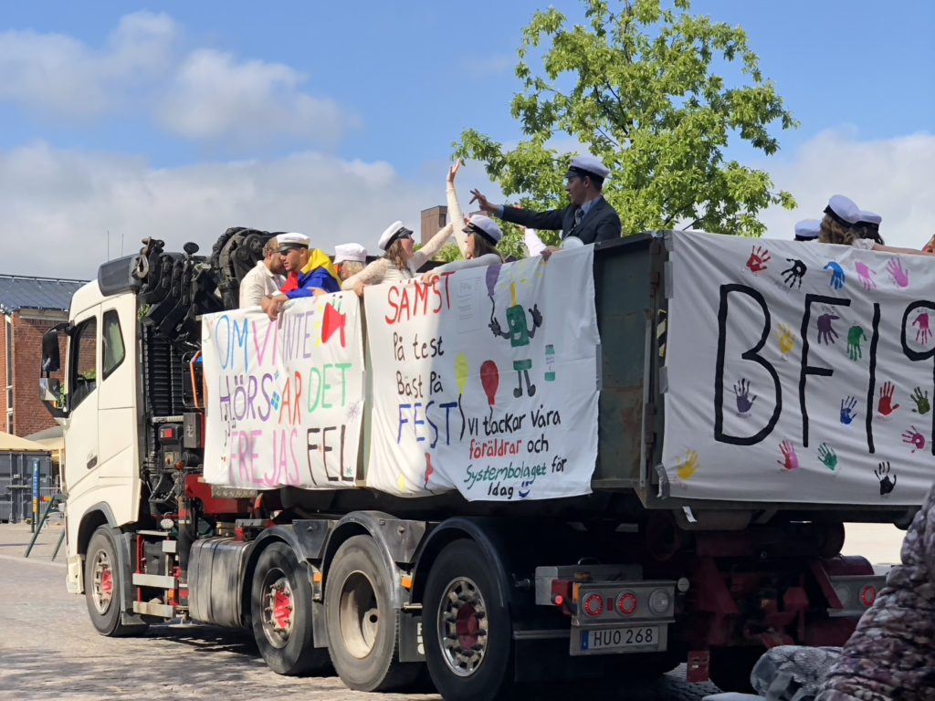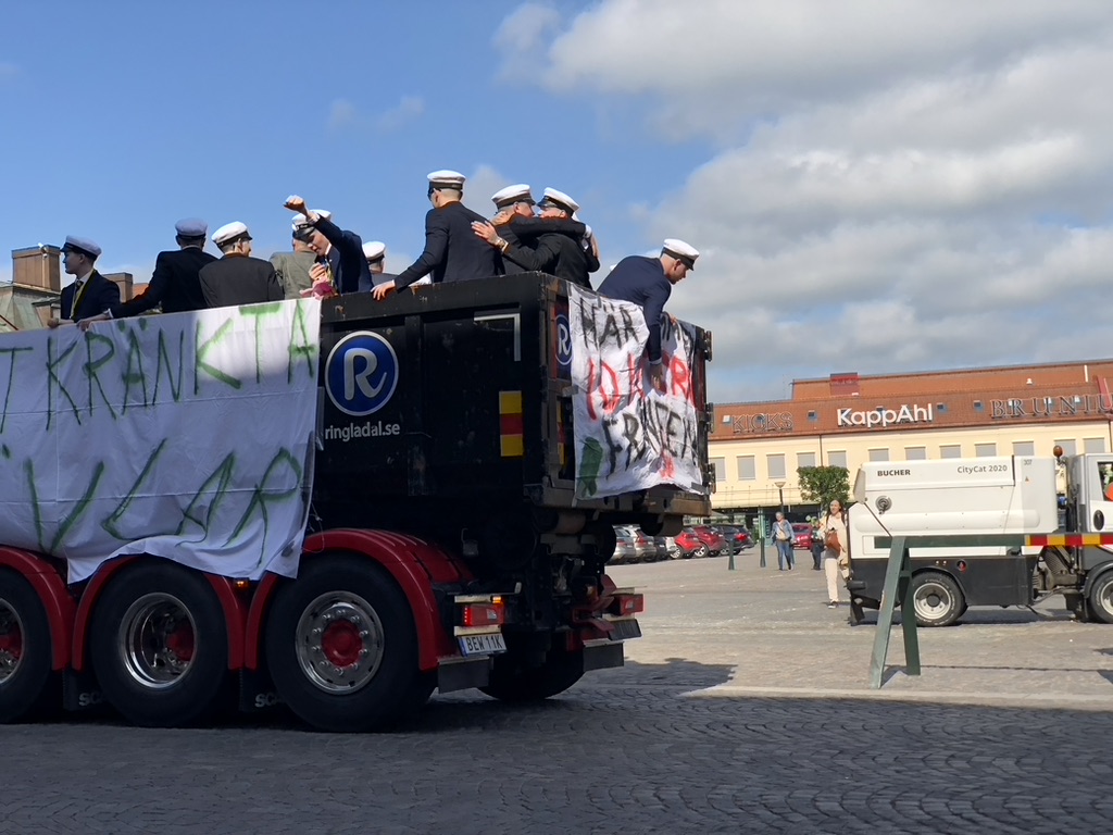 The girls completed their second school year in Sweden! They both had some fun end of year activities, while I passed my level 3 speaking make-up exam this morning – a 15 minute discussion on the topic of Lifestyle. I got stuck a few times but was able to give logical answers and get through it! We’ll have our level 4 results next week. It’s been a crazy week of Studenten (high school graduation) Ceremonies and parties. They party hard from the 7 a.m. champagne breakfast and on through the night, with a long break mid-day to sleep! Each day belongs to a different school and that school gets to parade through town blowing whistles etc and they get the trucks to drive them around town. But it is very organized chaos. Students drink but there are adult chaperones. Systembolaget even donates the champagne, apparently.