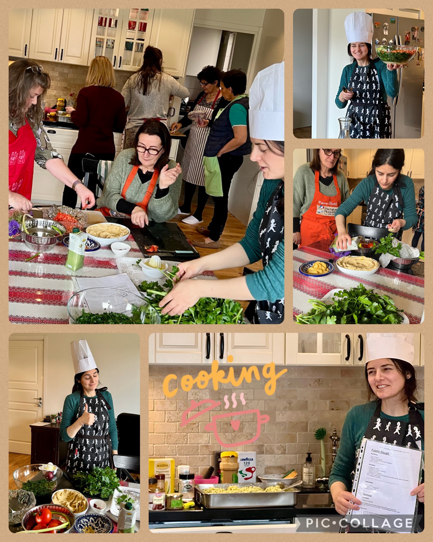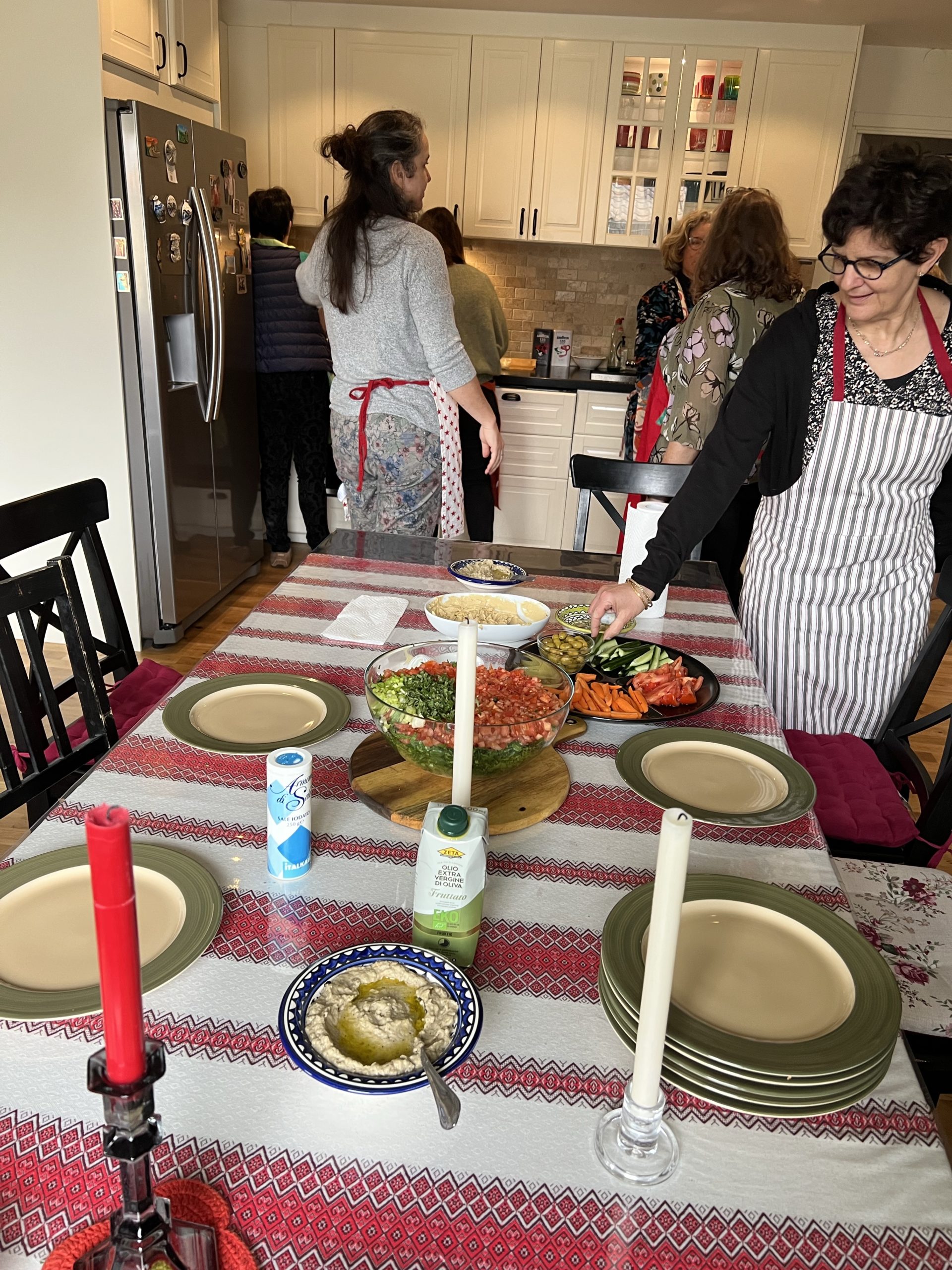 As luck would have it, cooking club was Palestinian food this month and I was able to implement some tips I learned from our host, Shereen, on making hummus- ice cubes help make it creamy!!! We made hummus, falafel, tabbouleh and baba ghanouj with amazing basbousa semolina cake for dessert!