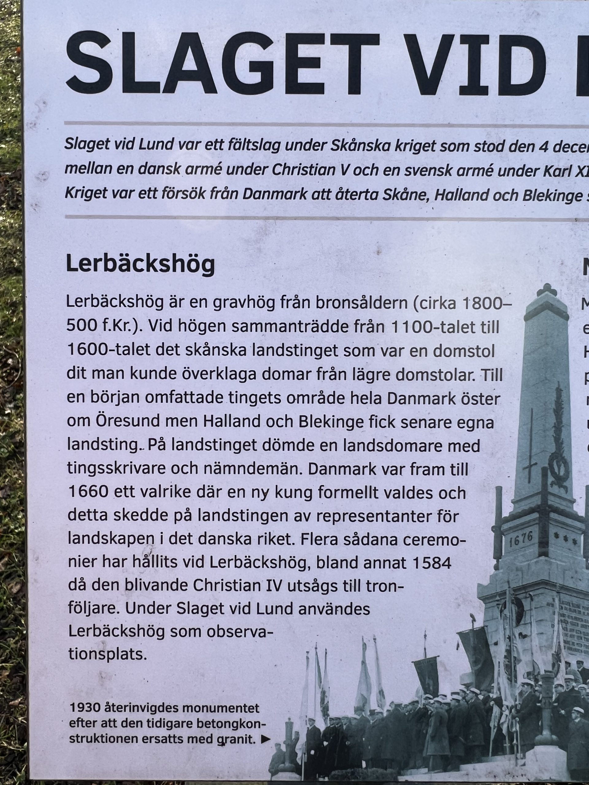 Here is a translation of the above text…The site, with the highest elevation near Lund, has been used as a ceremonial space since before the Bronze Age and was the site of many important meetings from the 12th century through 1676 when it played a role as an observation point in the Battle of Lund. The park features the monument commentating the battle next to Lerbäckshög, a burial mound from the Bronze Age (around 1800-500 BC). At the mound, from the 12th century to the 17th century, the Skåne county council met, which was a court where judgments from lower courts could be appealed. At first, the county council’s area covered all of Denmark east of the Öresund, but Halland and Blekinge later got their own county councils. At the county council, a judge with court clerks and jurors made their judgements. Until 1660, Denmark was an electoral kingdom where a new king was formally elected and this took place at the county council of representatives of the provinces in the Danish kingdom. Several such ceremonies have been held at Lerbäckshög, including in 1584 when the future Christian IV was appointed heir to the throne. During the Battle of Lund, Lerbäckshög was used as an observation point.