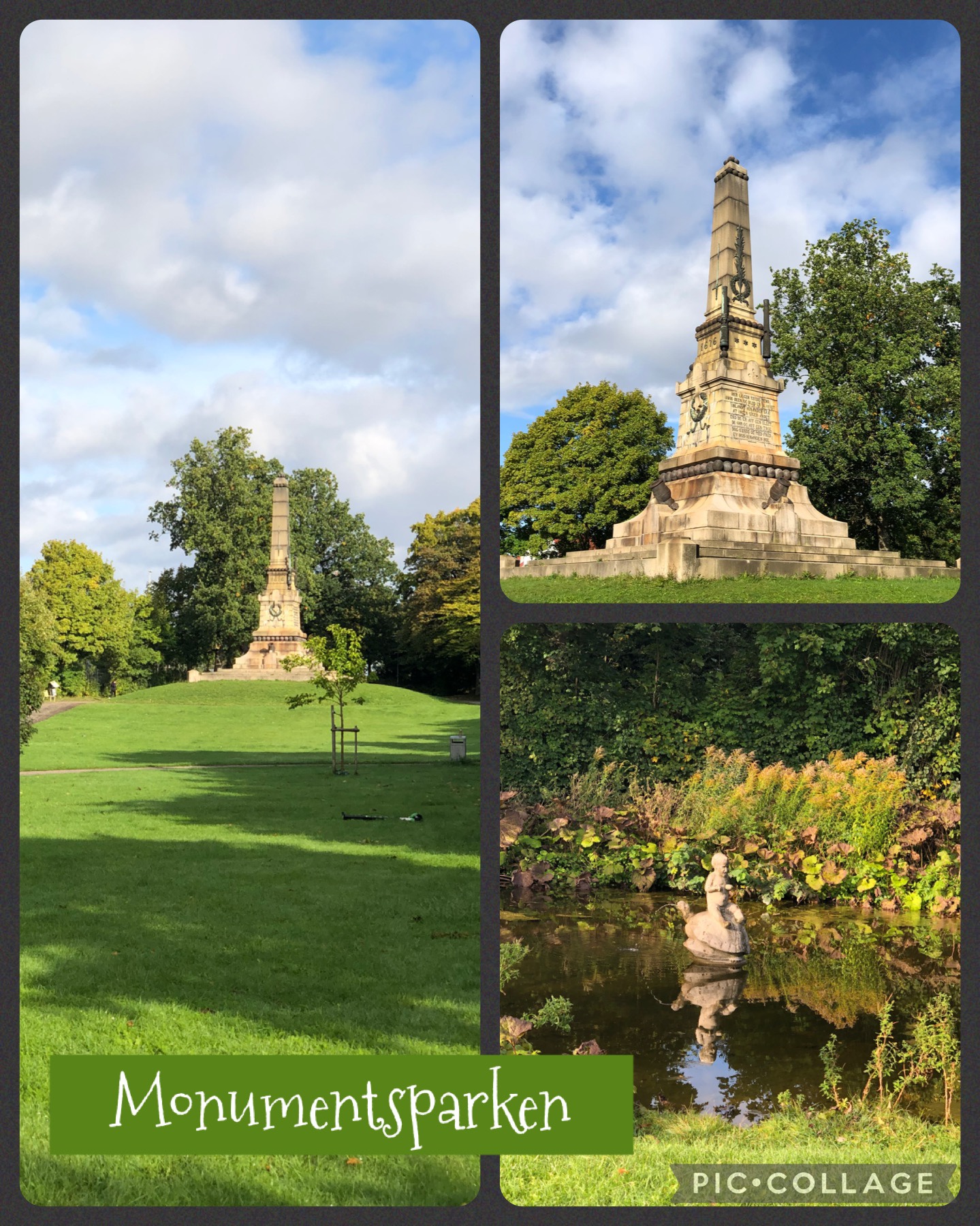 Just north of our apartment building, along the railroad tracks, is a park where I walk most days (photos from September) with the monument, a pond, and paths around the burial mound known as Lerbäckshög which is loosely translated as Muddy Stream Hill.
