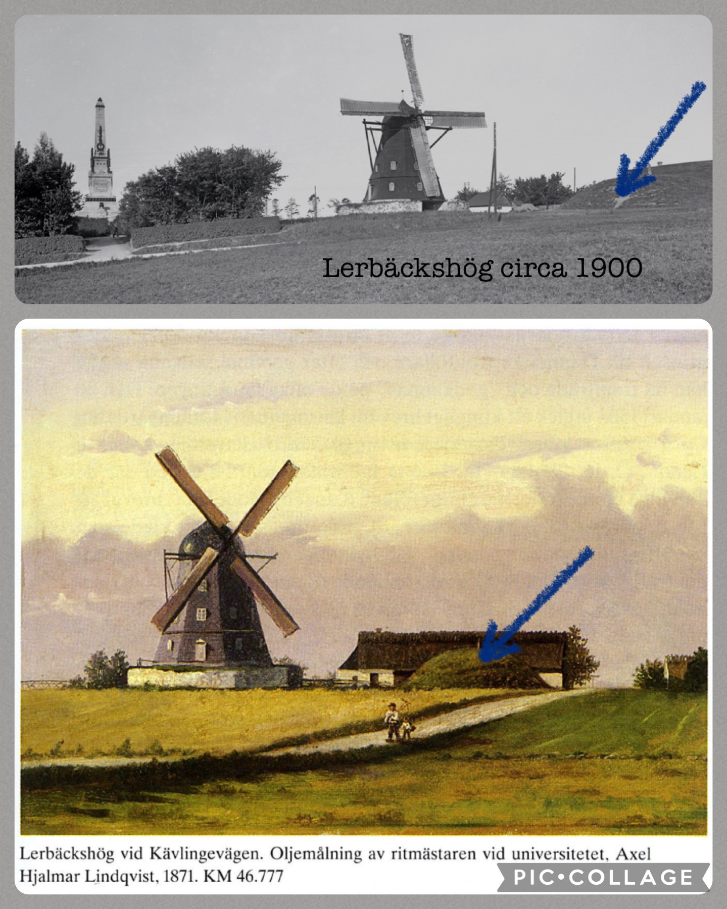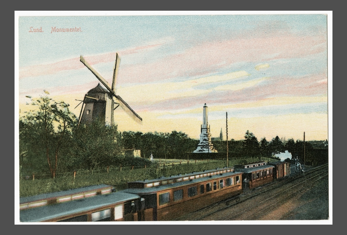 I found these photos of Lerbäckshög in earlier times. The painting was done when it was the last “king’s hold” in Lund. Now the wind mill is gone and the park is bordered by city streets to the east, train tracks to the west. Kävlingevägen is still there, the highway leading to the village of Kävlinge (wrestler, fighter)