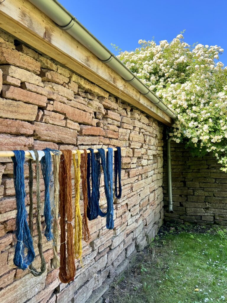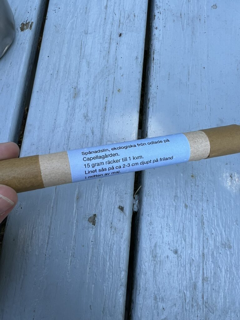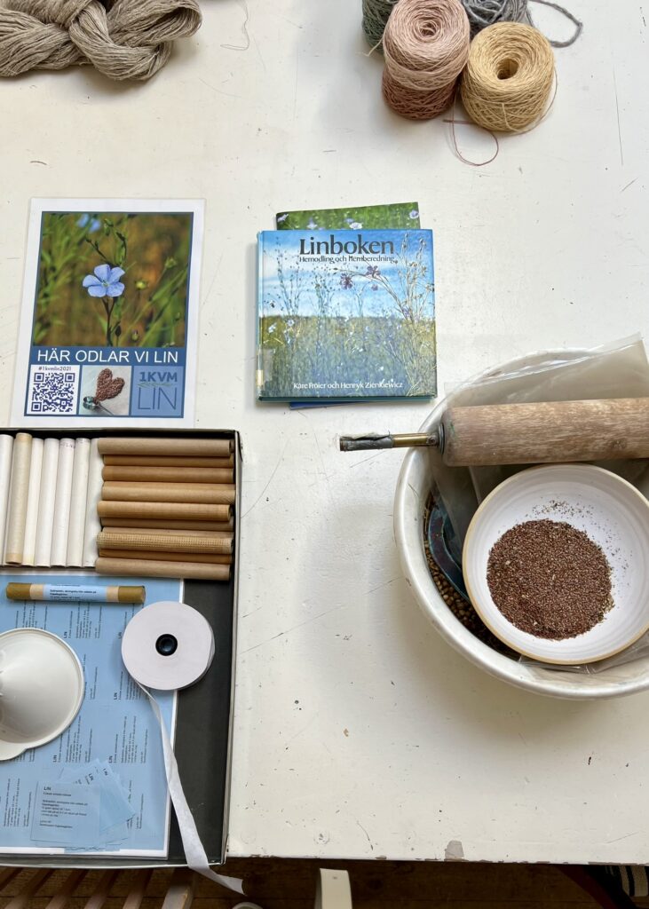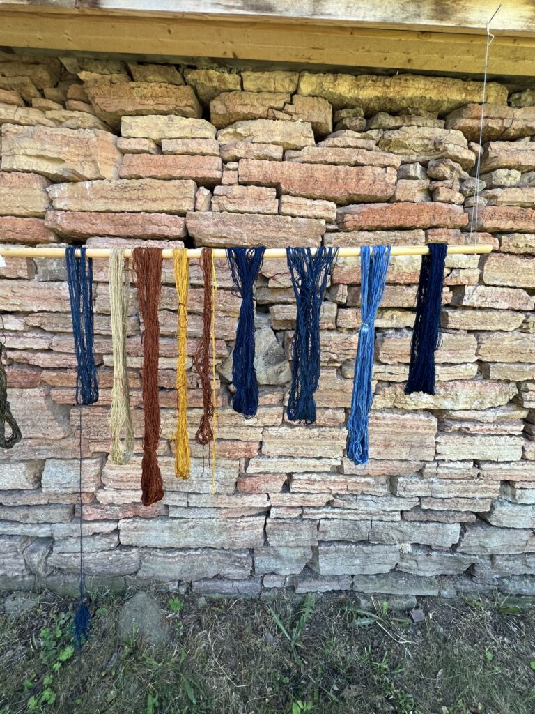 Spinning was the most difficult thing for me. I wasn’t quite able to get all the parts moving together and peddle with the right amount of force while holding, moistening and pulling out flax strands to create long unbroken twists of fiber. Luckily several of my group were experienced spinners and weavers so they managed to make enough to share and we could supplement with pre-spun. My contribution was mainly with the lin seeds, extracting the seeds from the pods, winnowing away the husk and then packaging them in recycled paper. I also very much enjoyed making skeins.