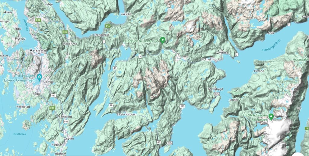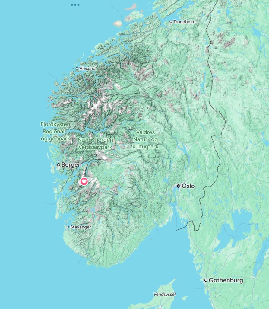 Bergen from Copenhagen is a short hour+ flight, where we rented a car and drove to an AirBnB in Jondal. That drive iteself is super picturesque! Here is an overview of where we were: