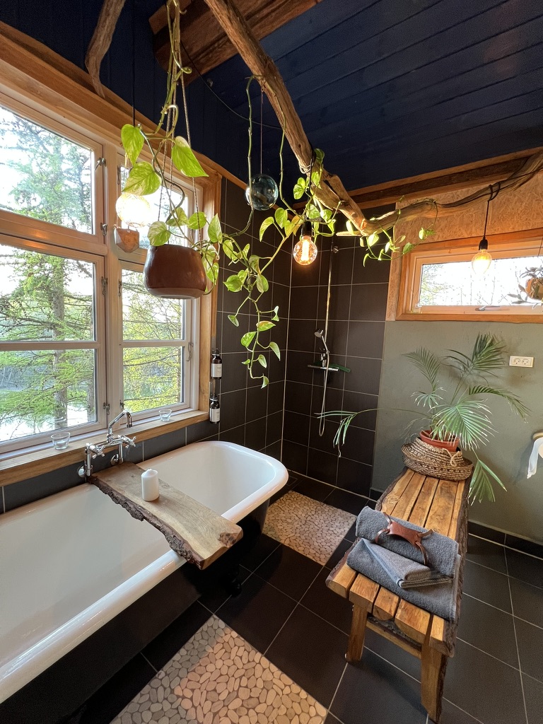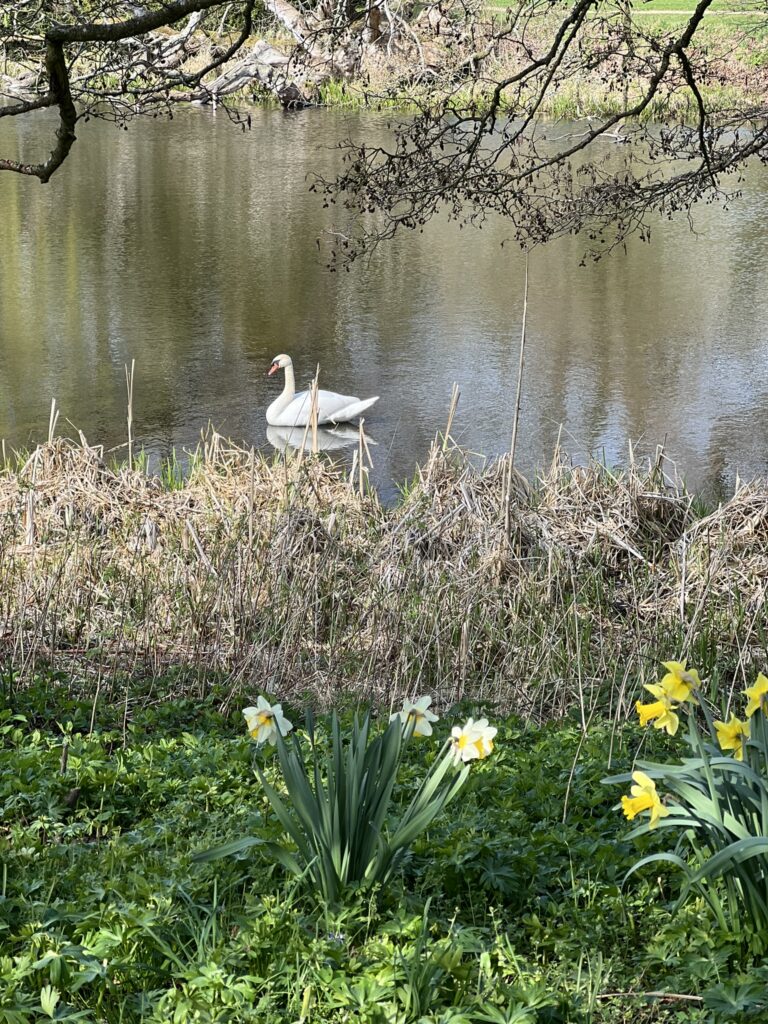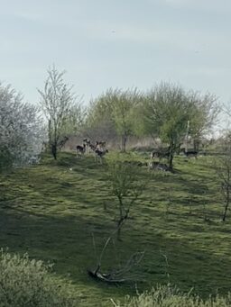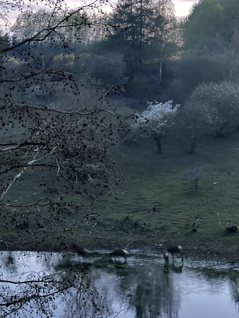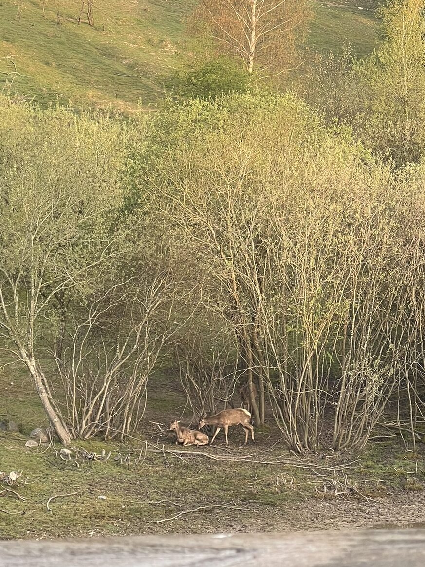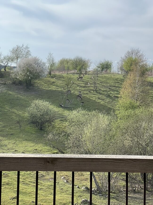 Glamping in a yurt also sounded like a good compromise for the 3 of us. Ebba got to cook (a meal that was prepped and waiting in the fridge) over a fire and we were almost camping in nature but with a luxurious bathroom nearby (plus access to sauna, hot tub) and cozy beds. The doors and windows could be closed up in case of weather and the space had climate control backup. At the same time we enjoyed our natural surroundings, with a view over a pond and meadow with lots of birds and deer. Truly, we had the best of both worlds because there were very few insects at this time of year. We especially liked the snuggle sacks that they provided, for sitting outside or going to and from the sauna. We even had binoculars! I saw lots of European robins and blackbirds, chiffchaff, finches, pheasants (very annoying calls, like a peacock) and water birds, as well as the deer, who came down from the grazing meadow to drink and explore the pond at dusk. Also, a male coot seemed to have beef with the ducks. It was very entertaining to watch their drama.