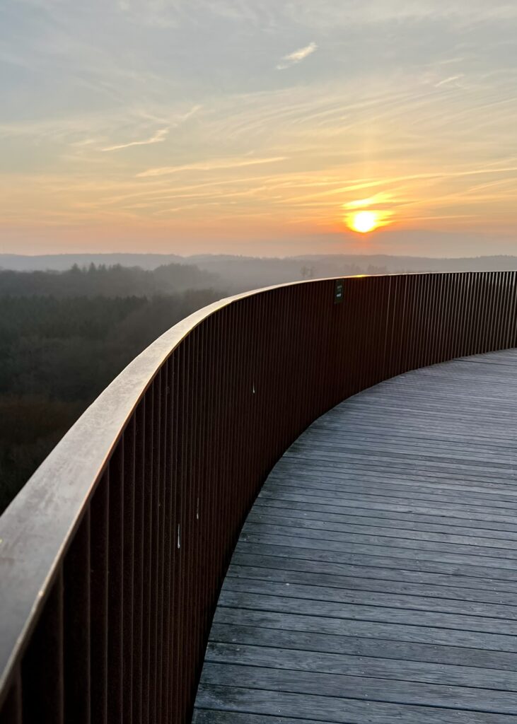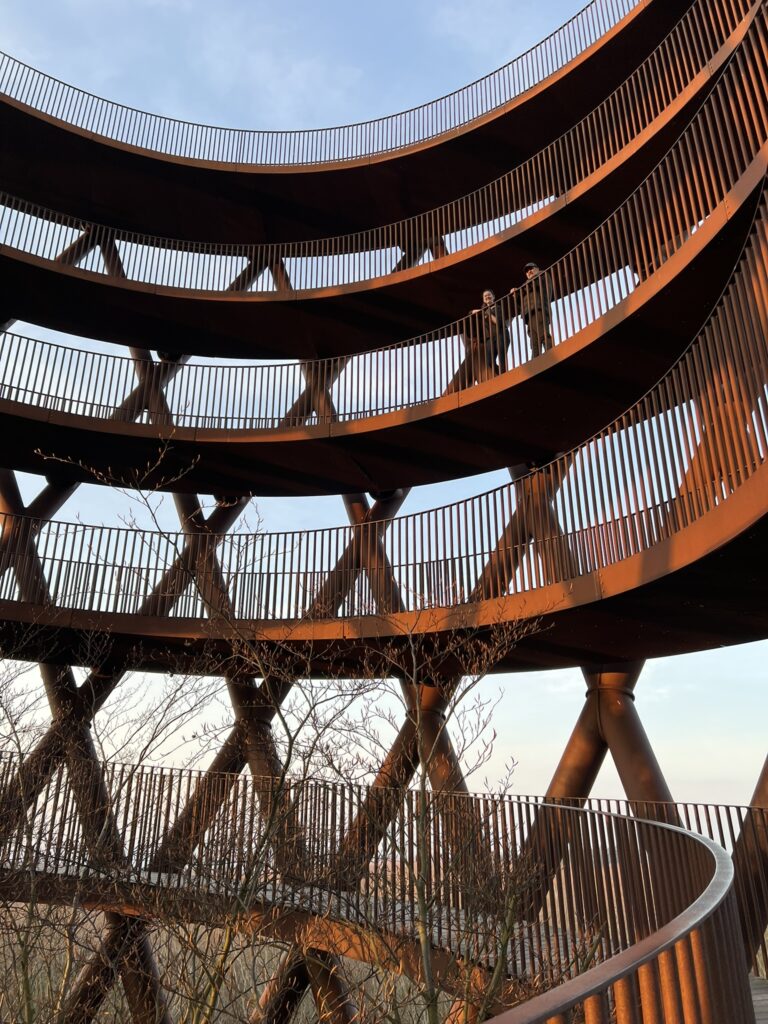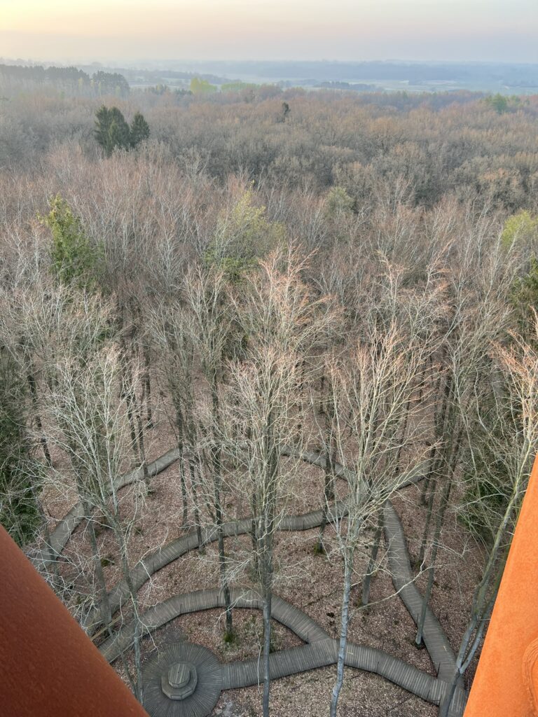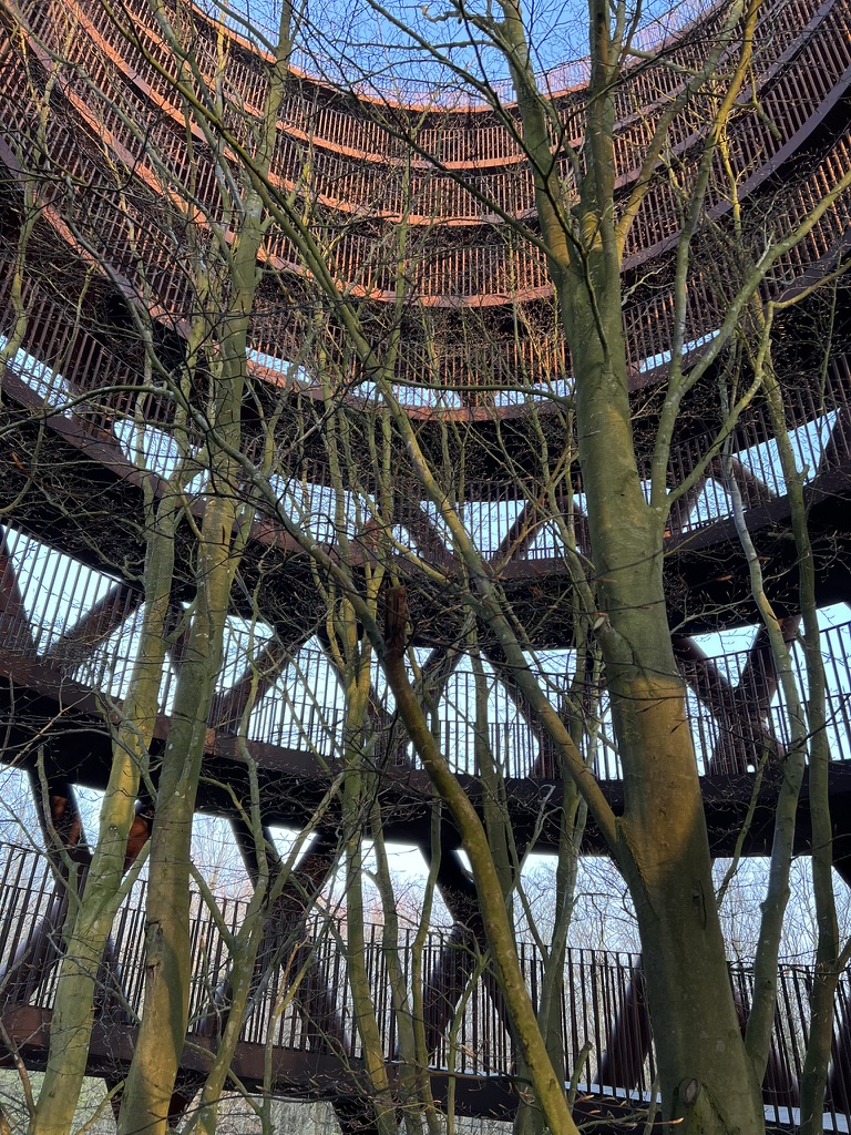 Just before sunset we made the 16 minute hike on a boardwalk trail through the climbing park to the tower, which was closed to the general public by that time so that only those who are staying in the adventure park have access. It didn’t take long to climb the 45 meter high Skovtårnet. The tower spirals slope gently upwards providing ever changing views of the forest as the sun lights up different sections. With each level, more birds could be seen roosting in the tree tops, catching the last rays of light. A thin, misty cloud cover seemed to enhance the golden hour and stunning views. Though we were not able to see all the way to Malmo, a sunset stroll climbing to 140 meters above sea level made for a memorable evening.