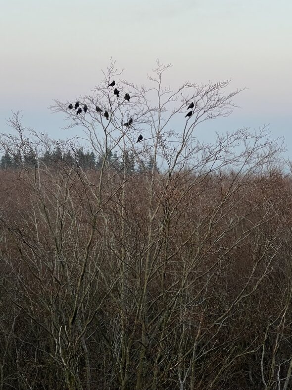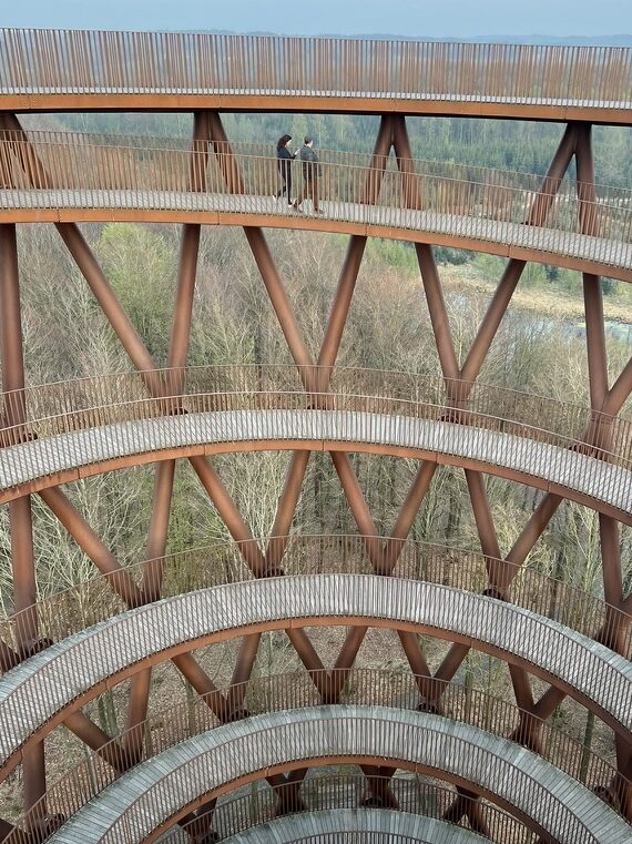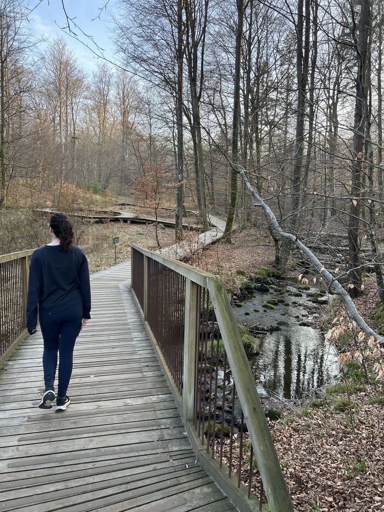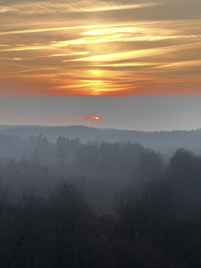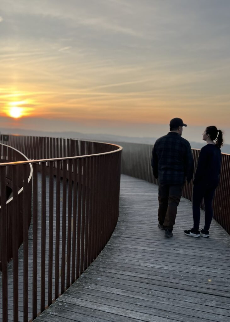 Just before sunset we made the 16 minute hike on a boardwalk trail through the climbing park to the tower, which was closed to the general public by that time so that only those who are staying in the adventure park have access. It didn’t take long to climb the 45 meter high Skovtårnet. The tower spirals slope gently upwards providing ever changing views of the forest as the sun lights up different sections. With each level, more birds could be seen roosting in the tree tops, catching the last rays of light. A thin, misty cloud cover seemed to enhance the golden hour and stunning views. Though we were not able to see all the way to Malmo, a sunset stroll climbing to 140 meters above sea level made for a memorable evening.