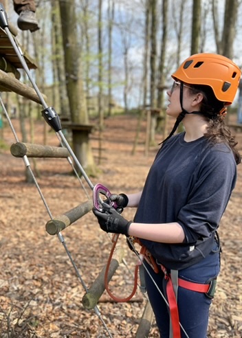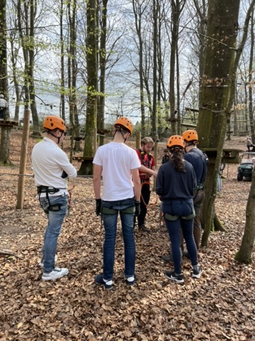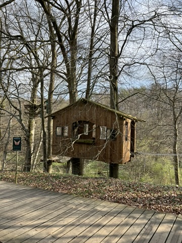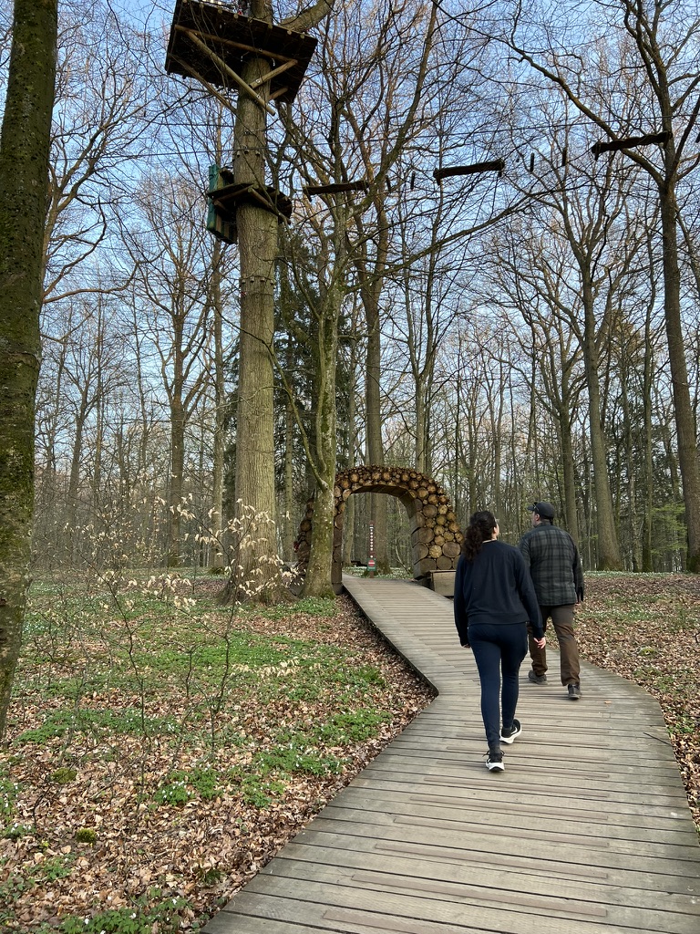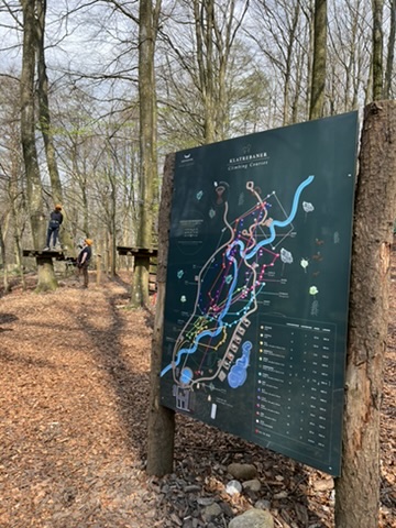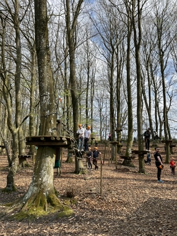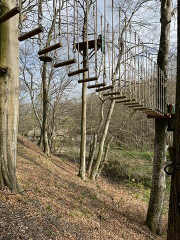 12 climbing routes offered amazing views of the beech forest. After a bit of safety instruction they were able to soar between treetops and navigate all manner of obstacles. Bryant endured plank crawling through swinging barrels suspended high above the ground with barely room to move! But for the most part they really enjoyed zip lining through the picturesque woodlands over rocky streams and the flora of early Spring.