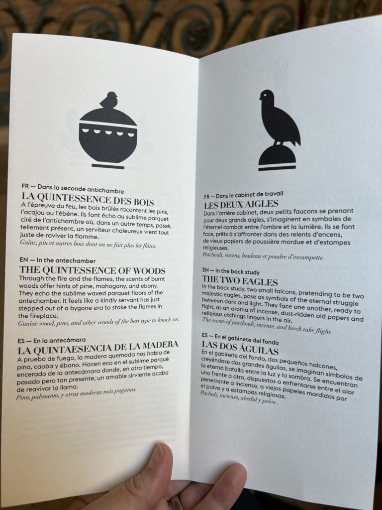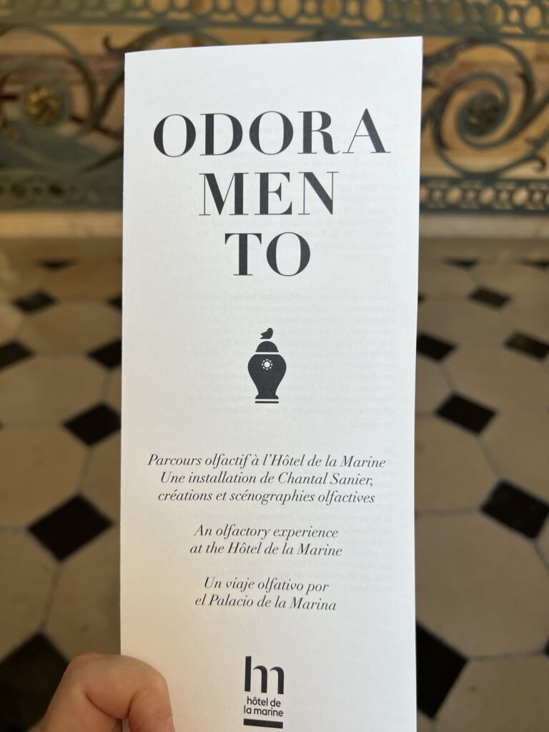 Also at Hotel de la Marine was a fantastic interactive tour of the royal “Garde-Meuble”. The audio guide responds to your movements as you walk through the exhibit. If you want to hear more about a particular space, stand still and the story will go more in depth. If you want to skip something or hear it in a different order just move to another spot and the audio adjusts to where you are located. Standing at the desk pictured below, for example, it tells about the abolition of slavery. Or in the dining room you can listen to extensive details about the food. I especially enjoyed the olfactory experience of Odoramento! In fact I’m going to try some of the scent blend “recipes” using my essential oils.