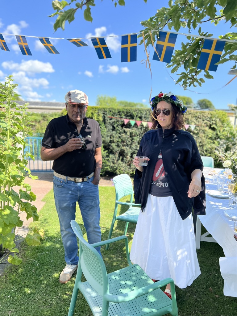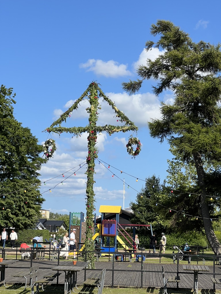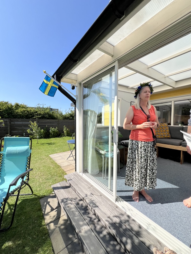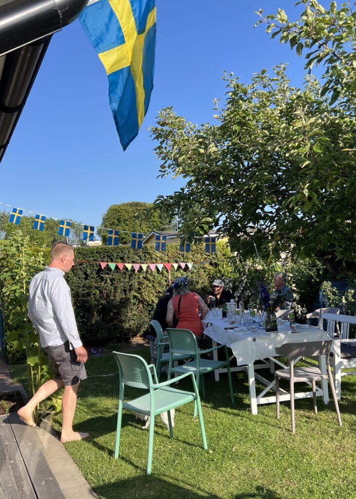 Time flies and here we are at Midsommar! This year Bry and I joined friends at their Sommarstuga in Malmö. With perfect weather, amazing food and great company we experienced the ultimate Midsommar. We weren’t able to stay for dancing Små Grodorna around the sommarstång but we did toast with shots of elderflower schnapps! The girls had their own celebration combining their two friend groups at the beach, complete with strawberry cake made by the eldest. So everyone had a delightful time. We also met Rhaenyra, the German Shepherd pup for the first time and got reacquainted with Lucy and Pasta. The menu included cheese pies, home smoked salmon, and the traditional herring and potato etc with fruit pavlova for dessert. Delish. We sampled yet another type of pickled herring, this one with sandalwood and cinnamon called Matjesill. I’m almost a fan of sill and really enjoy it twice per year!