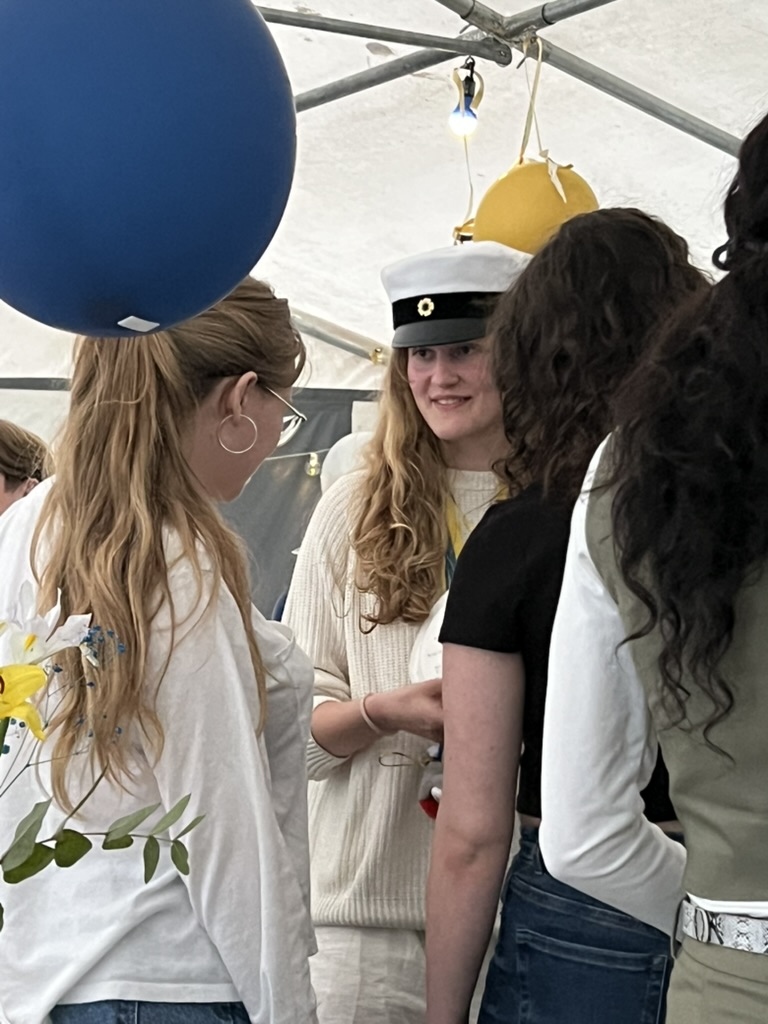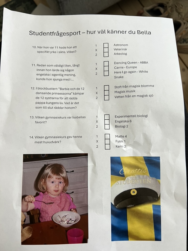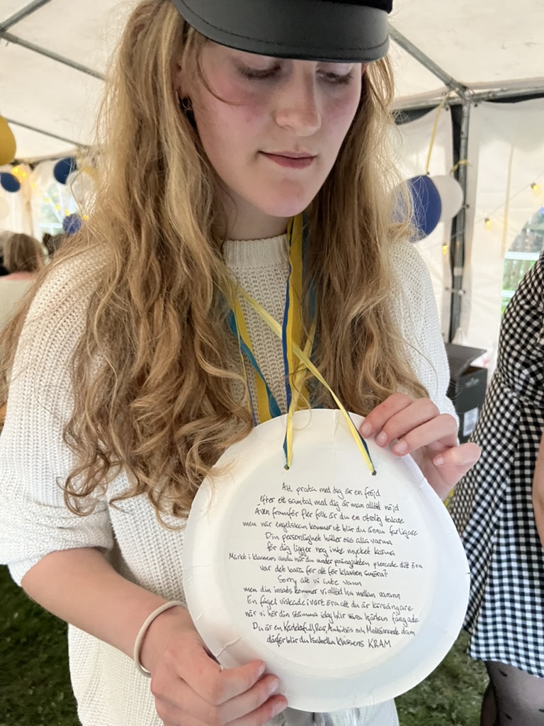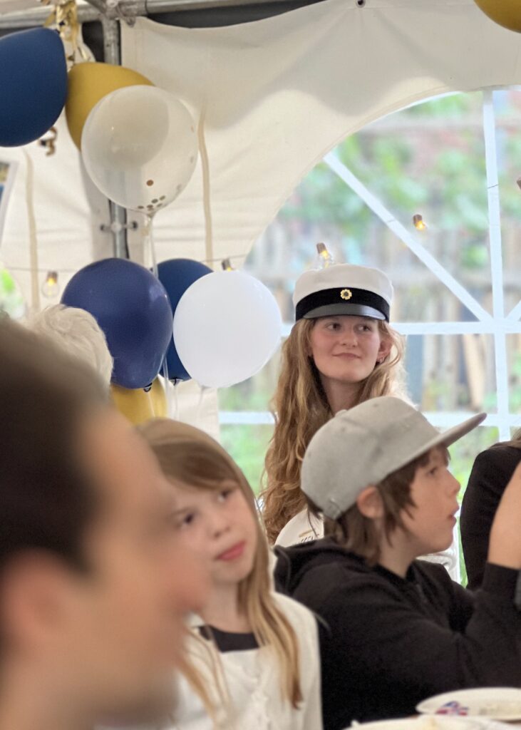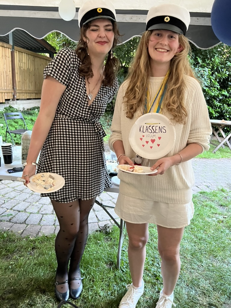 Our upstairs neighbor, Bella, graduated from Katte but in the Swedish program, not the one our kids attend. Her family went all out and set up a big tent in the courtyard. The party was much like a typical celebration in the US, though there are lots of elements, like the truck parade, the running out, and the paper plate awards that give it a Swedish flare. And of course the captain hats which have an interesting history.