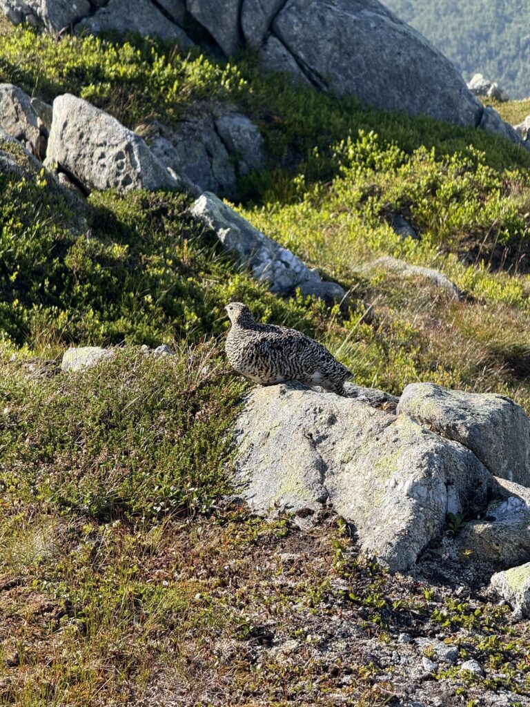 For this day, we rented a car so that we could get a bit farther out from the town. This hike was the same distance but higher to the summit of Synnøvjord peak (8,2 km and 760m of elevation), and had an amazing summit and views of the mountains and islands all around! UT.no link here. The final push to the summit was a bit much for H, so she napped (!) while L and I went the rest of the way. While the summit itself was a huge reward (L’s first summit, and amazing views), there were some bonus moments, like the ptarmigan that let us get quite close to photo and the break to dip our feet in the creek on the way down. Given that we were in midnight sun times, there was no worry about getting off the mountain late!