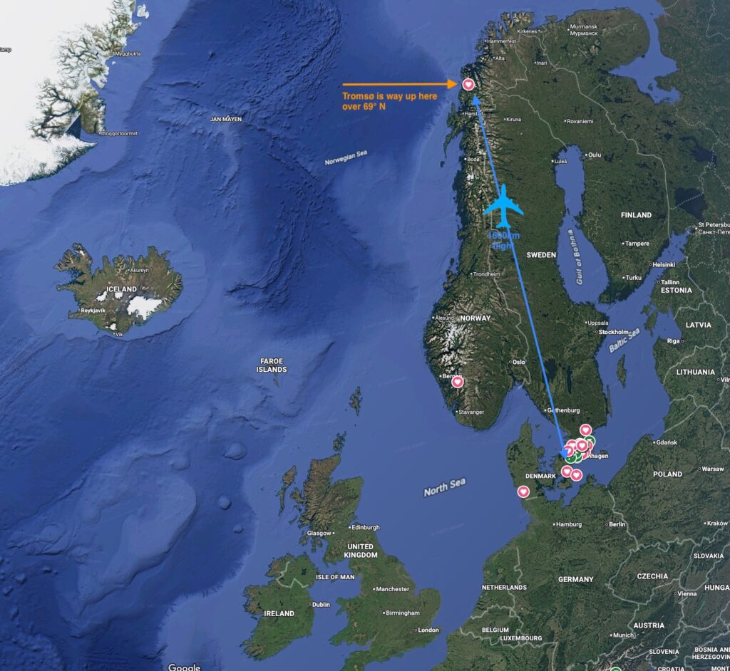 Day 0 started with a short-ish 2,5 hr afternoon flight from CPH to TOS, which is a cute little 5-gate airport right next to the city. Same flight time from CPH to Nice – and about the same distance, just in the opposite direction! We grabbed a taxi to the apartment and settled in. It was a quite nice little apartment close to the centre and had all the things we needed. It was a bit anxiety-inducing with a bunch of weird alarms (like a moisture alarm that went off in the middle of the night every night, or a crazy sprint to a fire alarm panel 2 floors away if the fire alarm goes off), but overall it was cosy and had good room for us and gear. We spent the evening grabbing (a typically Norwegian over-priced) burger and shopping for basics. And, of course, just gaping at the stunning surroundings! Especially from the air, Norway looks like a fantasy land.