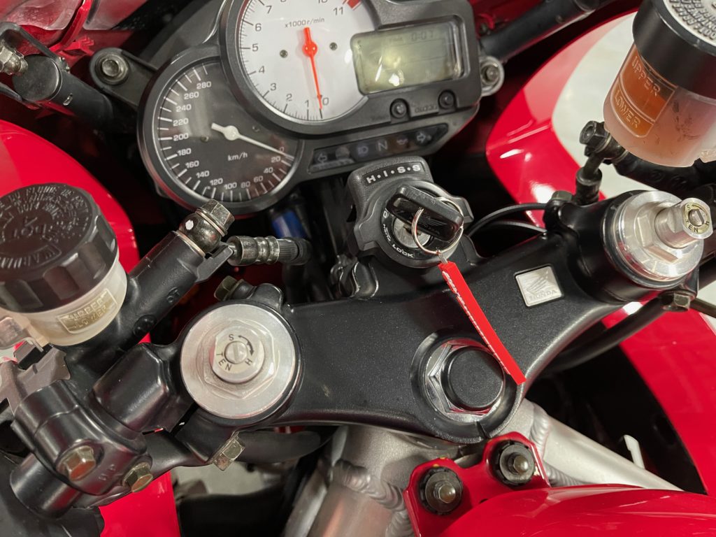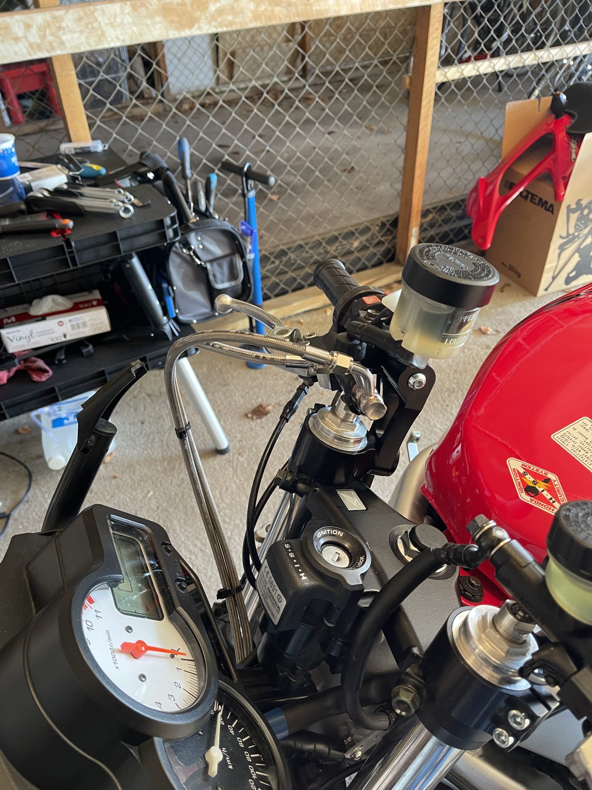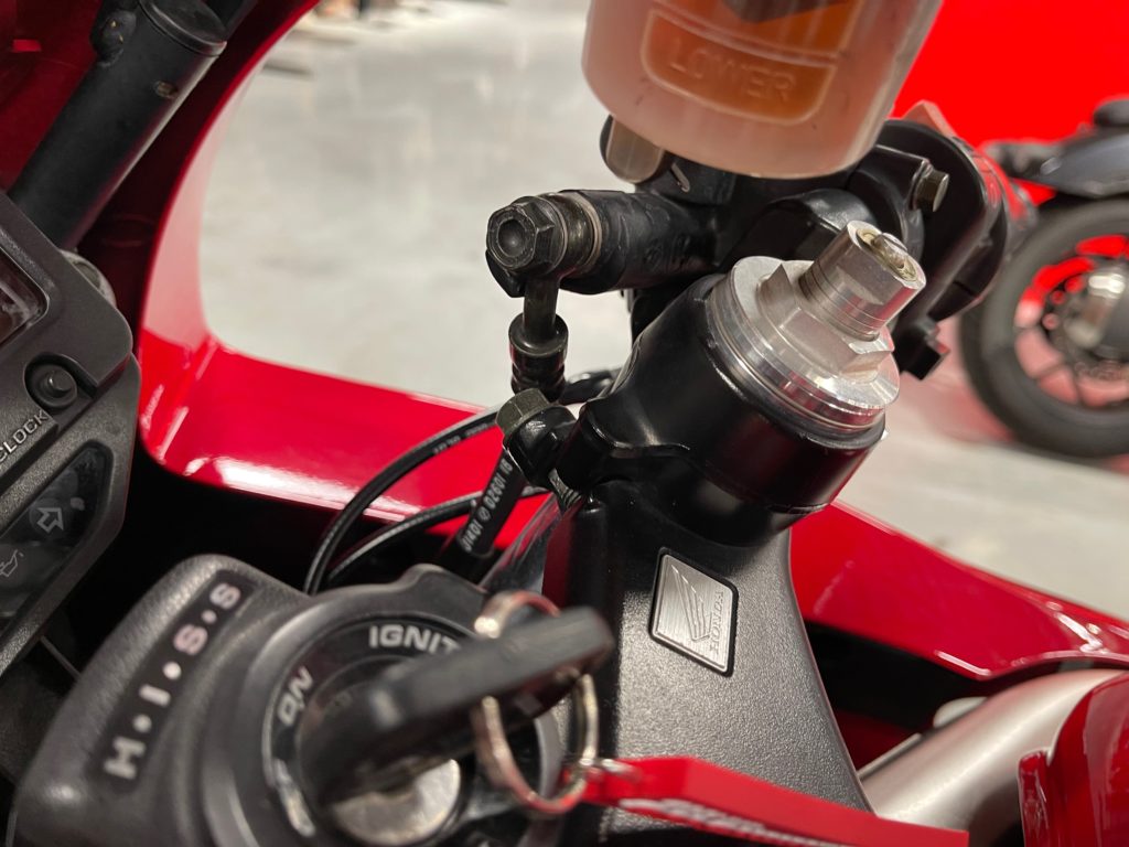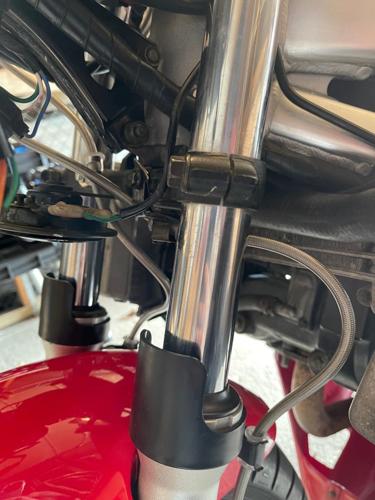 And, yes, I got the lines a bit too long. At least it gives me room to play with future bar setups! I also fab’d a small bracket for the clutch line to be relocated. Finally, I drilled out the steering stop blocks and added some small screws to tighten in the steering stops by about 3mm on each side. Keeps the switch gear from hitting the tank on full lock (and the steering locks still engage nicely). That wasn’t really worth taking a picture of.