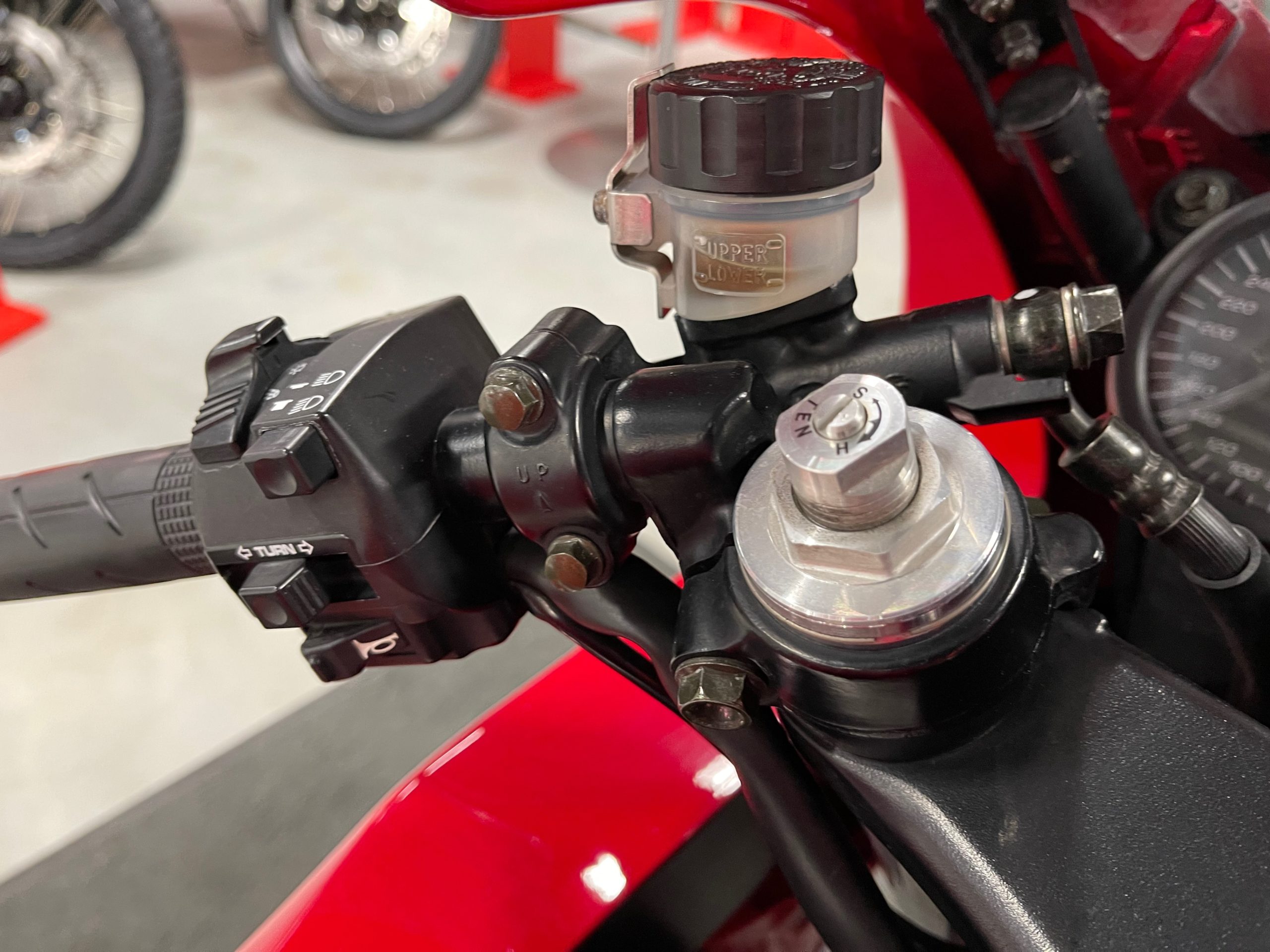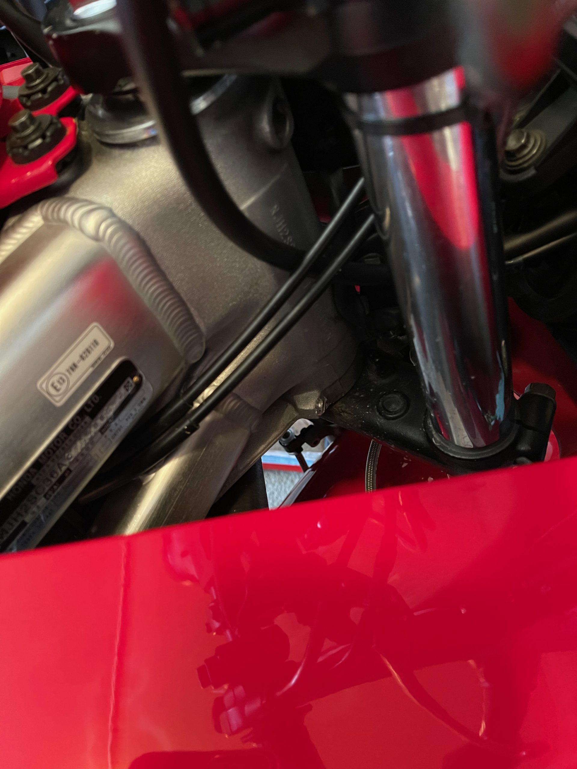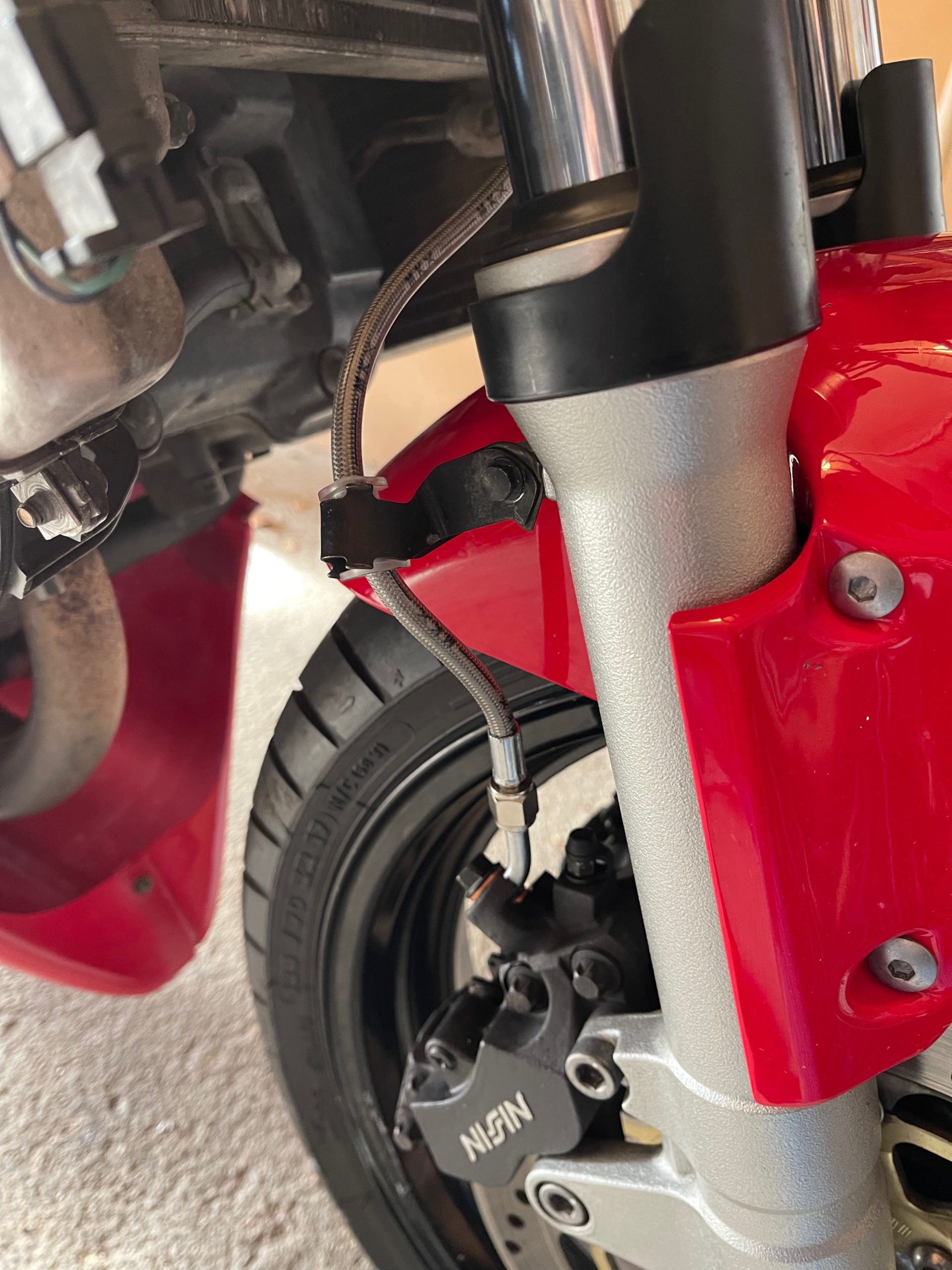 And, yes, I got the lines a bit too long. At least it gives me room to play with future bar setups! I also fab’d a small bracket for the clutch line to be relocated. Finally, I drilled out the steering stop blocks and added some small screws to tighten in the steering stops by about 3mm on each side. Keeps the switch gear from hitting the tank on full lock (and the steering locks still engage nicely). That wasn’t really worth taking a picture of.