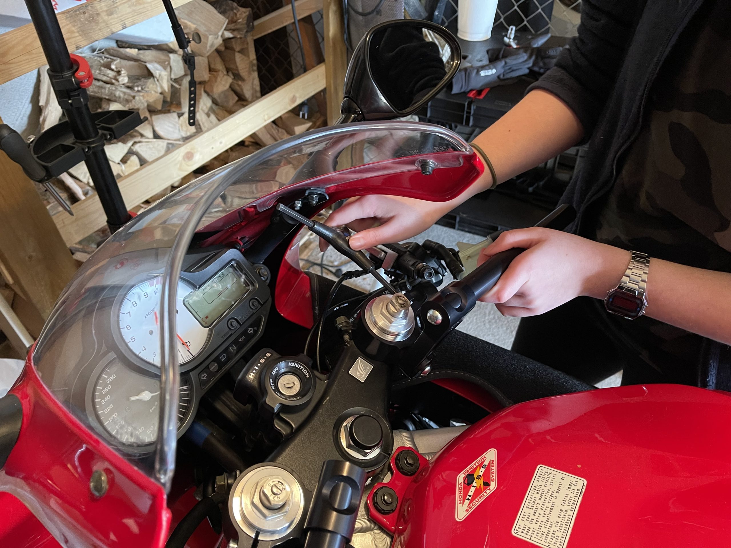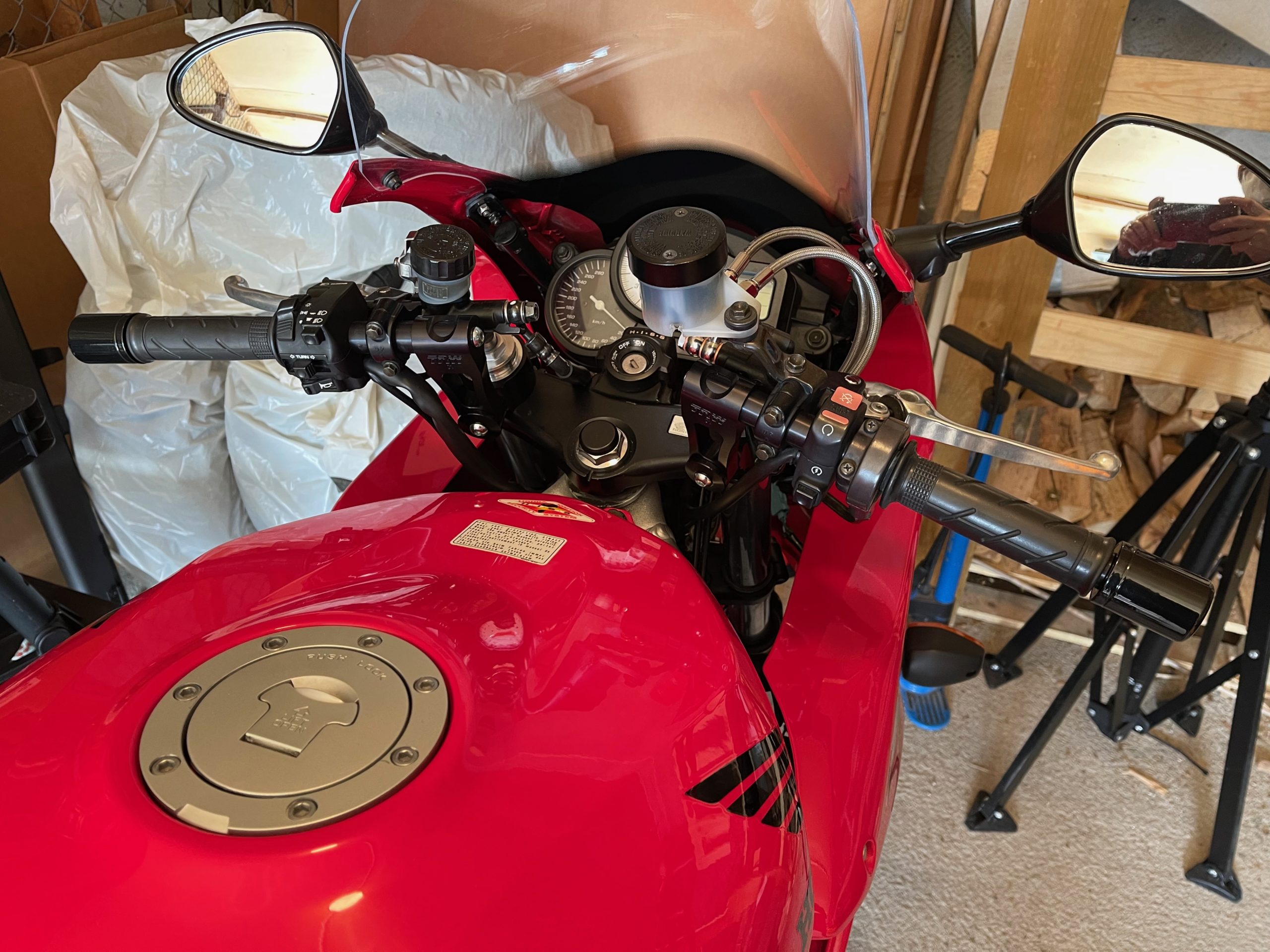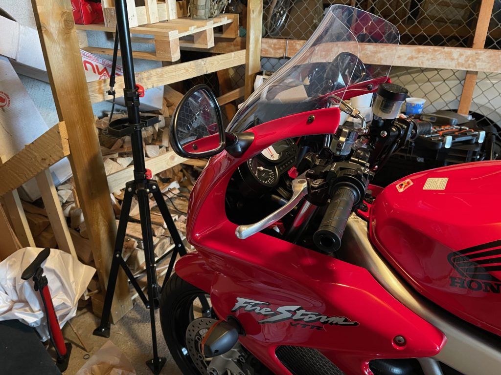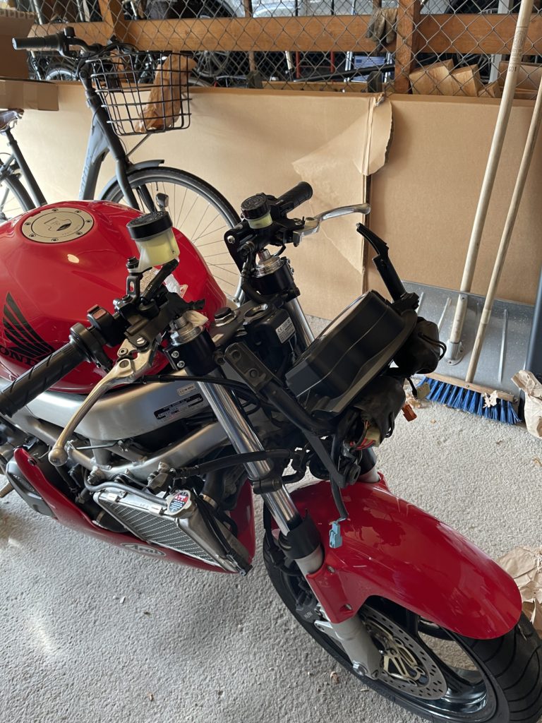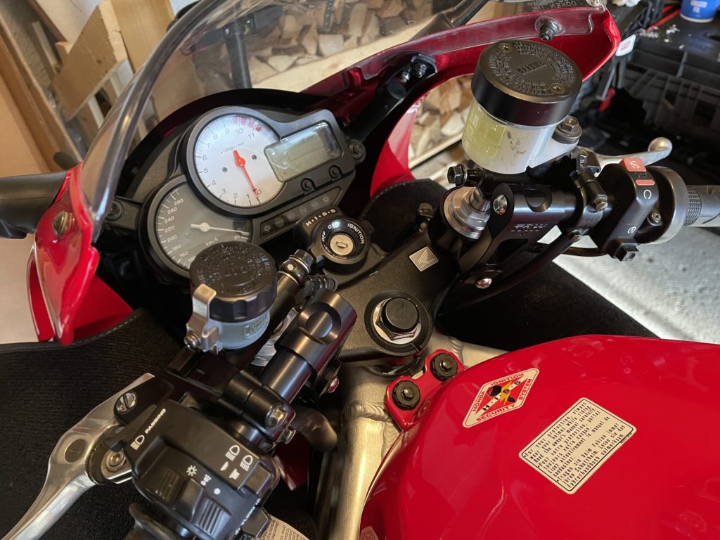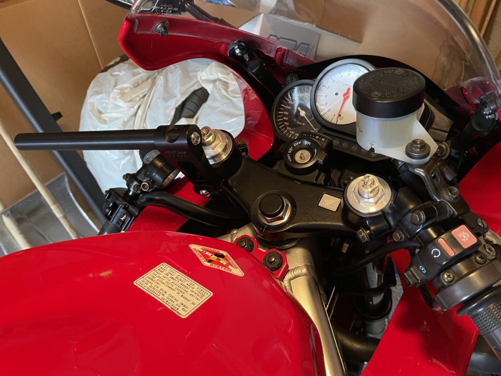 First project was to swap the clipons for some 60mm rise TRWs. They are a nice build quality, and save me the hassle of a full upper-triple clamp swap. I DO really like the look of superbike bars on these VTRs, but I am pacing myself. I did this (mostly) in an afternoon with L helping.