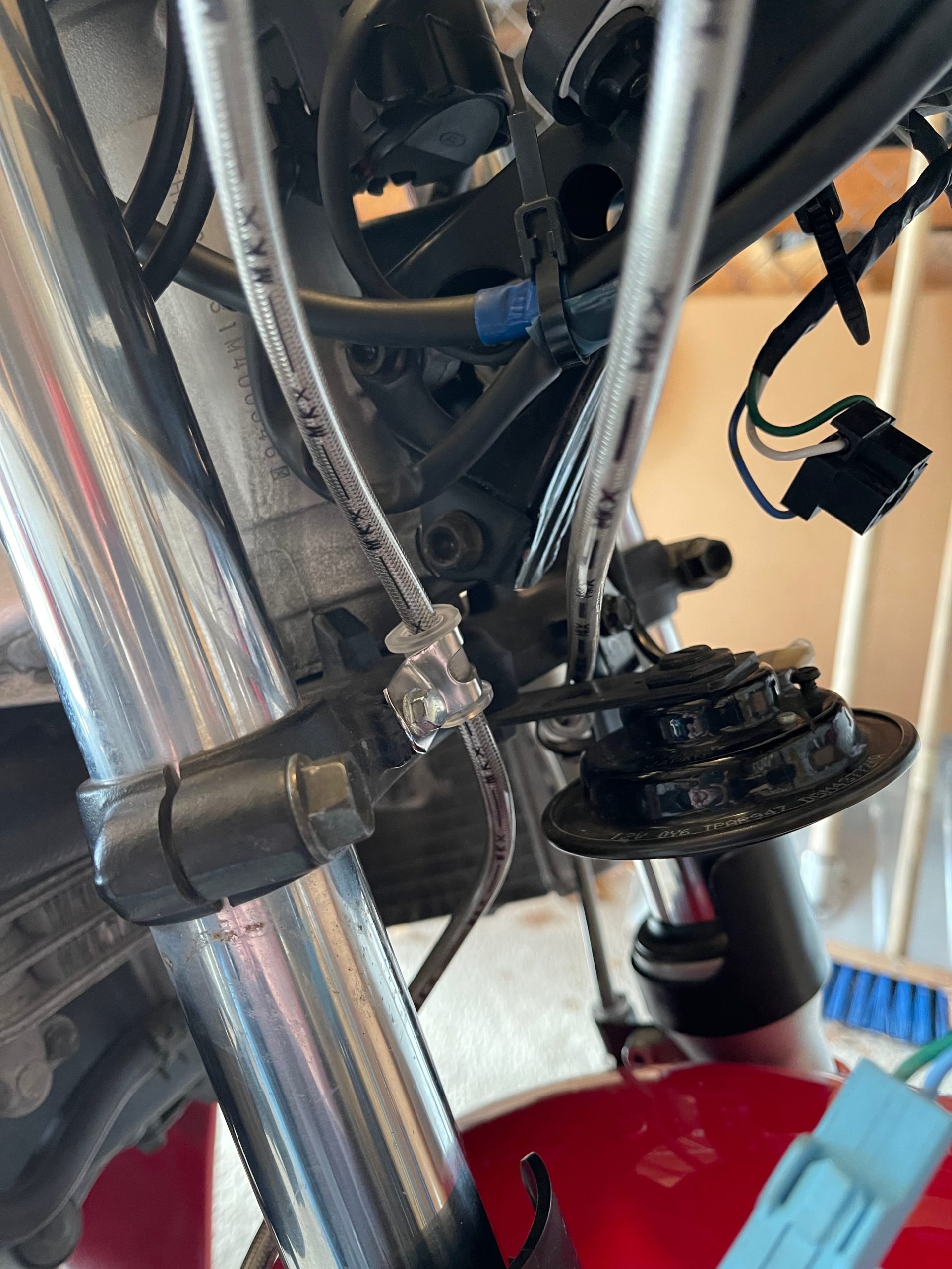 There is only one irritation (aside from the cramped knees), and that is that at full left turn lock, the edge of the fairing hits the kill switch … Oh, and the horn line is not long enough so it is currently disconnected … Next project (along with a USB charger).