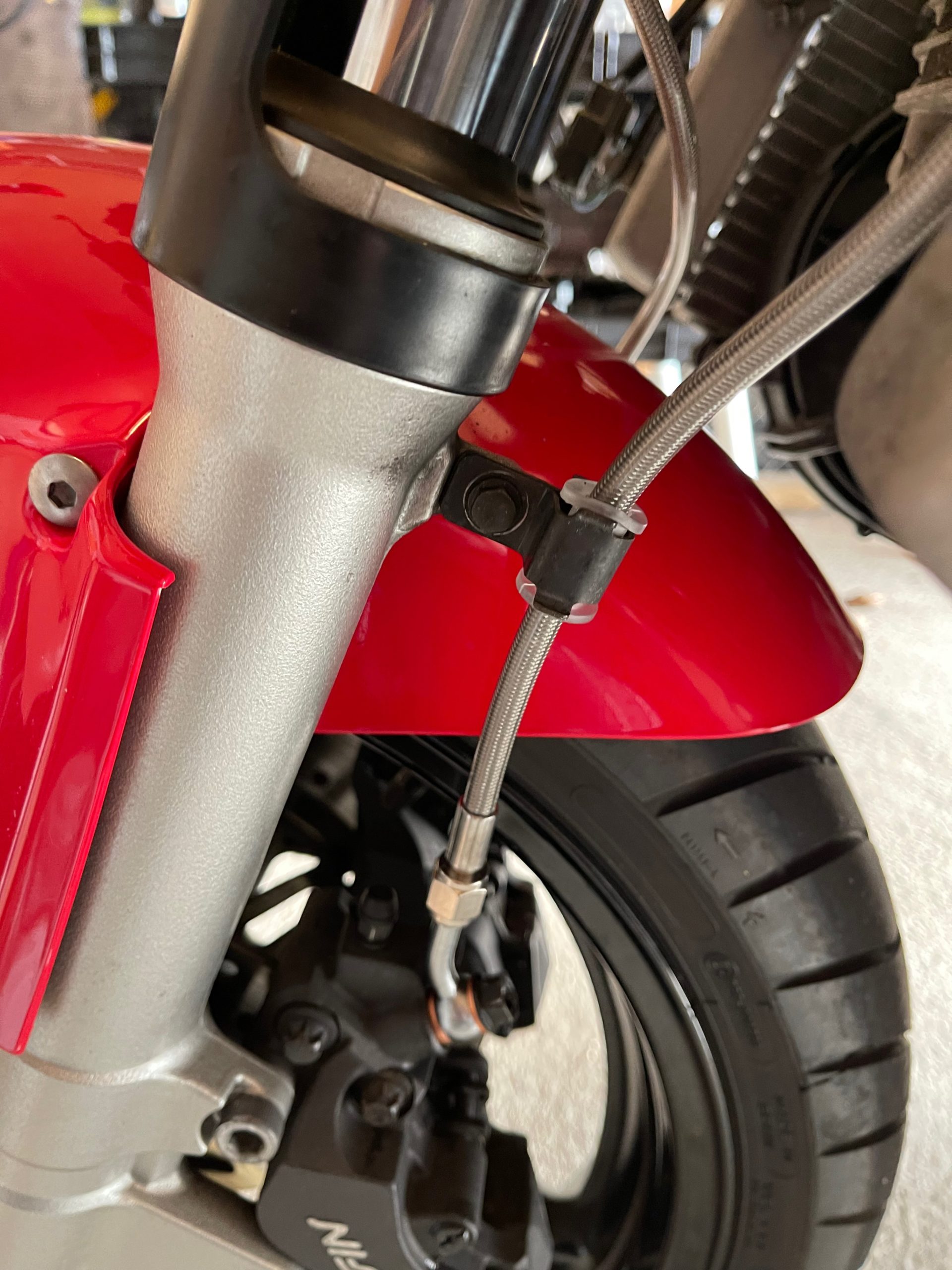 I also made sure that there was a generous bight in the sections that span over the fork travel zone. The stock lines had a 2-into-1 set up with a bolt-on hydraulic block at the junction. That meant that I needed to fabricobble a clip on the right side. When the new, properly threaded double banjo bolt arrives this coming week, the top will look something like this. Next week should be bleeding brakes, new windscreen, and maybe a ride?