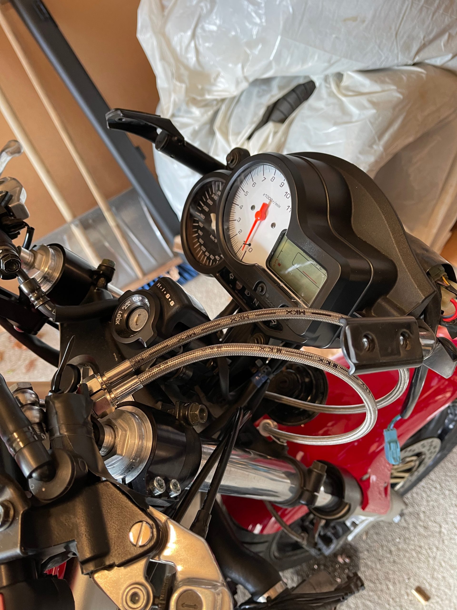 So, need brake lines, and new bar-ends to fit the ID of the new clipons. So far, it does not look like I will need to cut the fairing. Things remain to be seen, however.